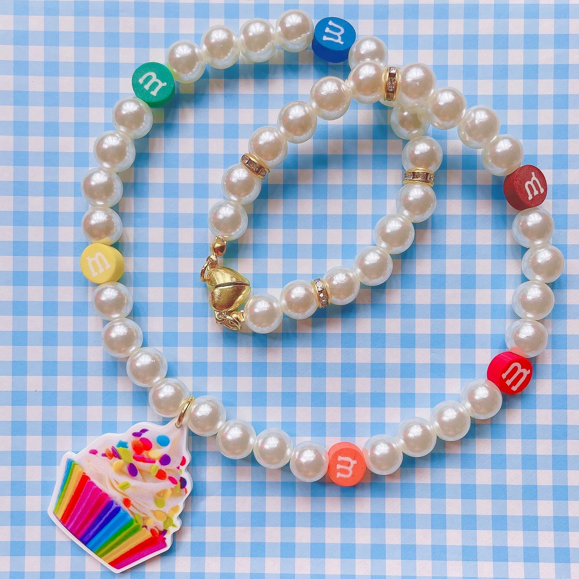10mmパールにmチョコクレイを挟んだ、カラフルカップケーキが揺れるネックレス。