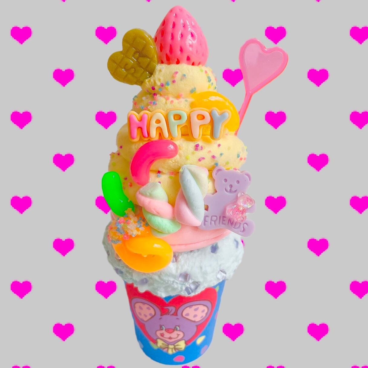 ゼリービーンズやツイストマシュマロ、グミッツェルなどをトッピングしたうずまきソフトクリームをドーナツの上にのっけました。
