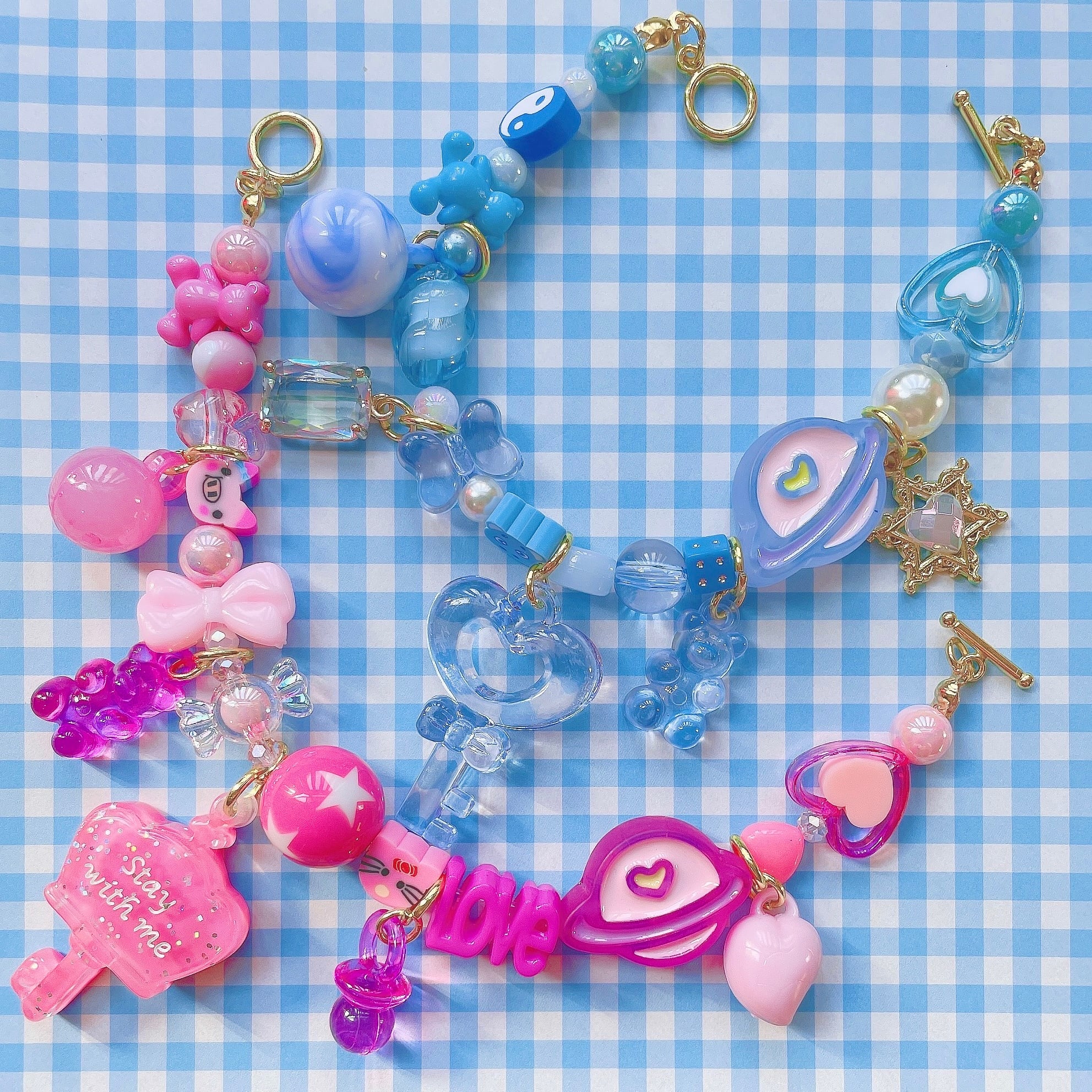 ピンクとサックスで使用しているビーズやチャームの種類、配列が違います。