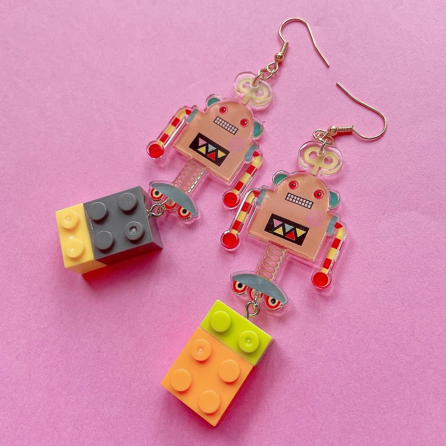 積み立てたミニチュアブロックに、アクリルのロボットが立っているようなデザインです。