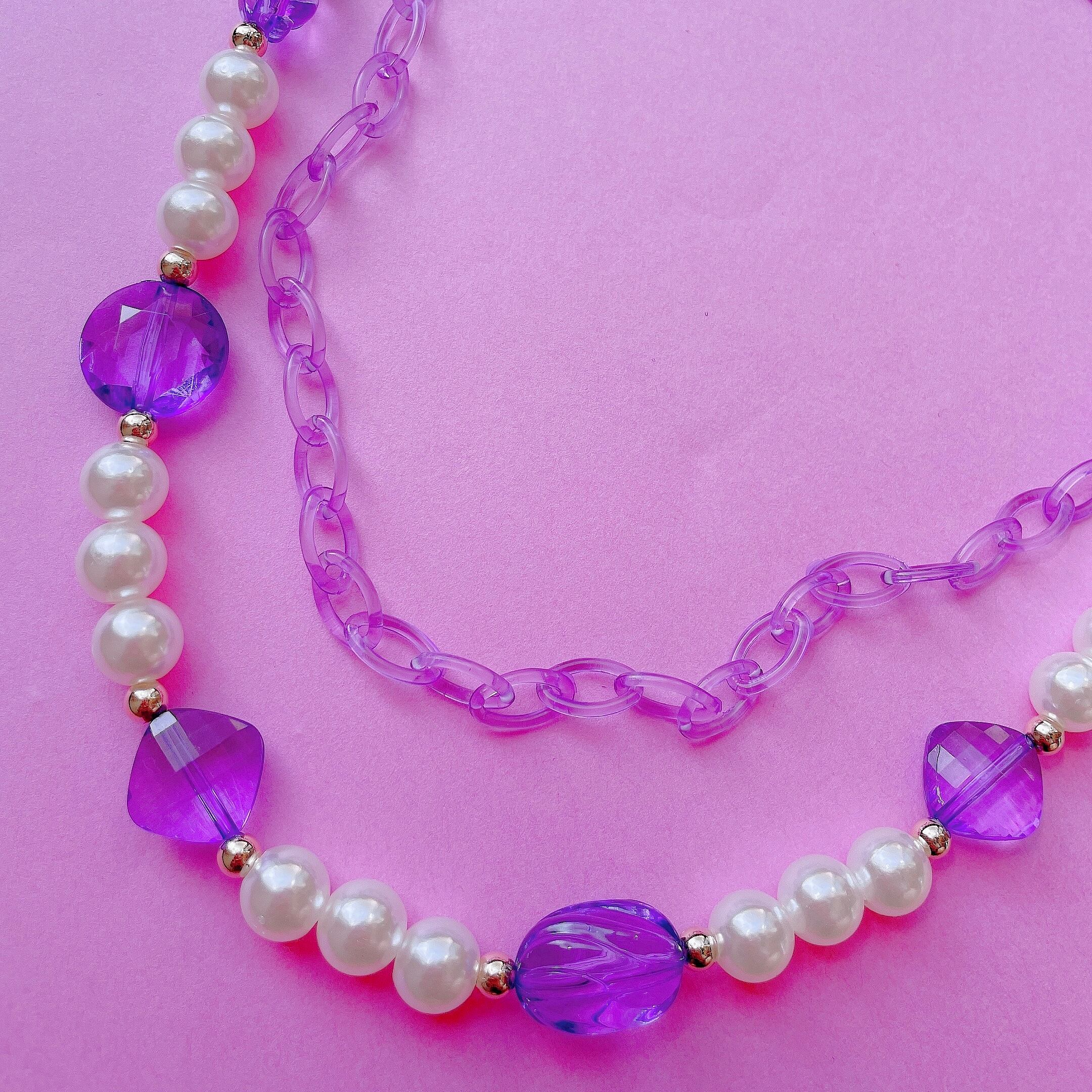 まるで大粒の宝石のような、多面カットアクリルビーズを間に挟んだパールとフロストチェーンの二連ネックレス。