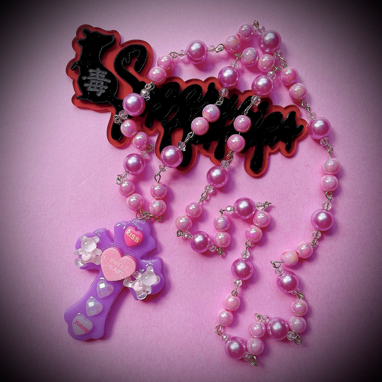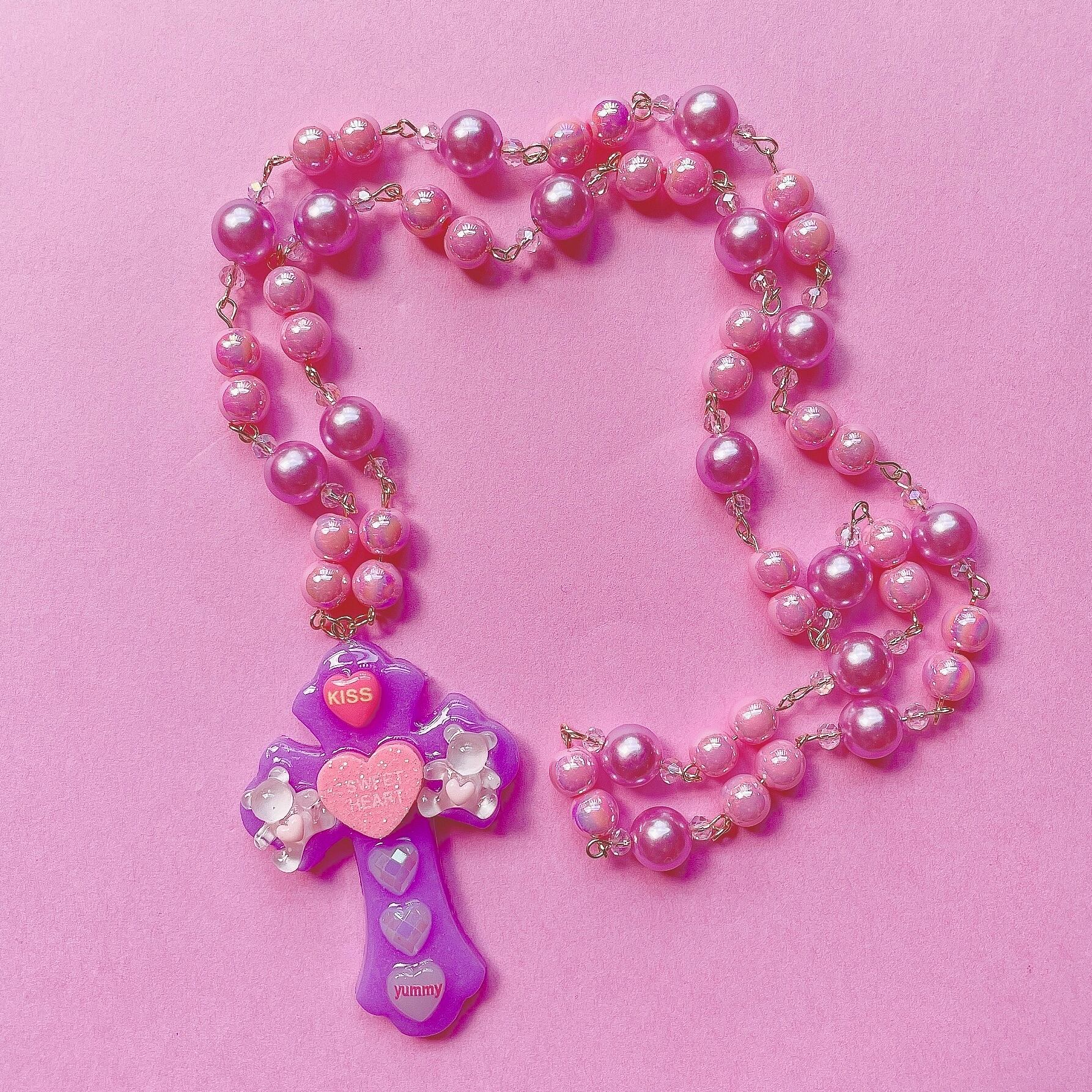 今回はパープルクロスにキャンディハーツやくまさんなどを散りばめて、チェーン部分にはパープルの10mmカラーパール、オーロラピンクの8mmカラーパール、多面カットガラスビーズを連ねました。