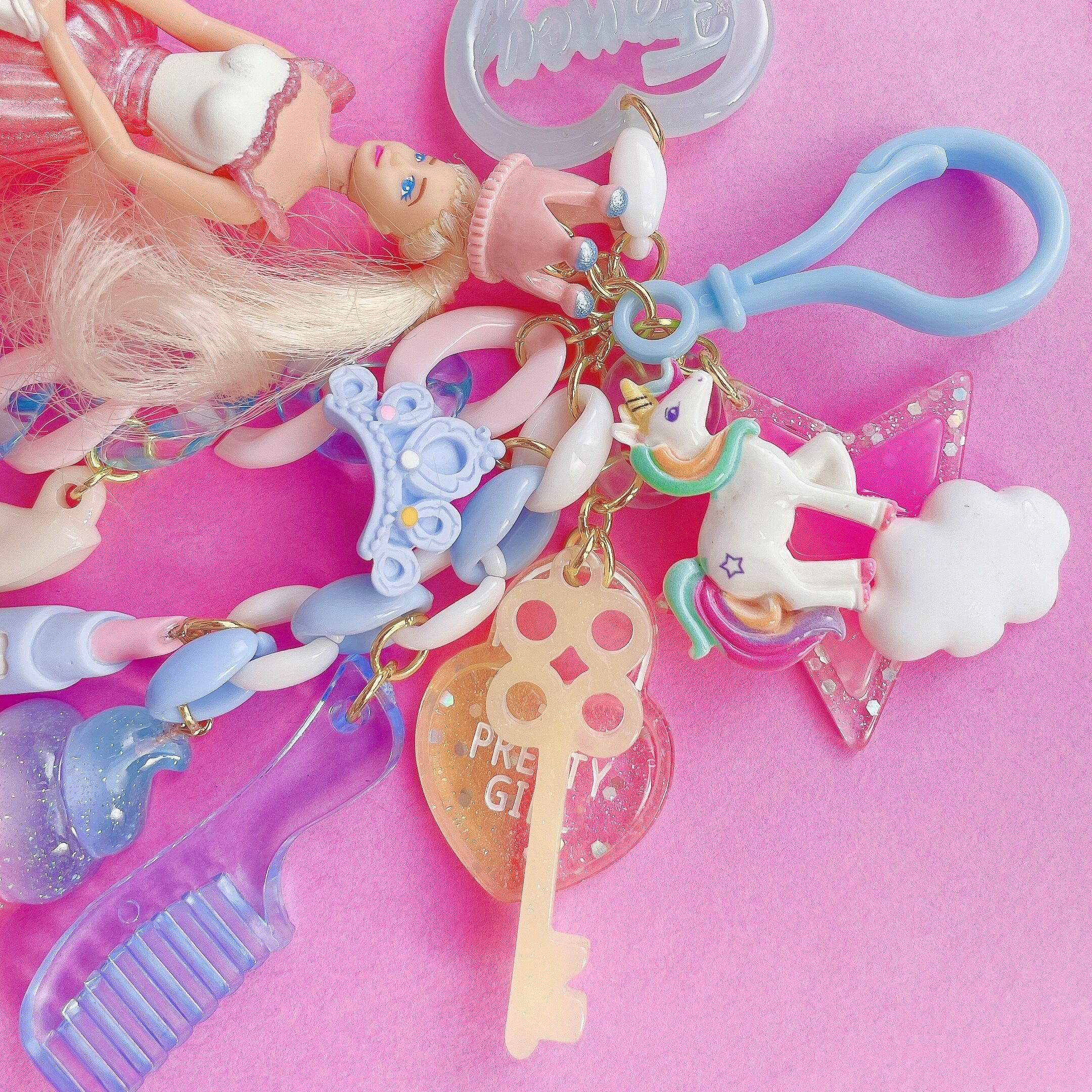 高さ約11.0cmの立体USドールをメインに、木馬やハイヒール、ティアラにヘアコームなど10個のチャームが付いたじゃらじゃらキーホルダー。