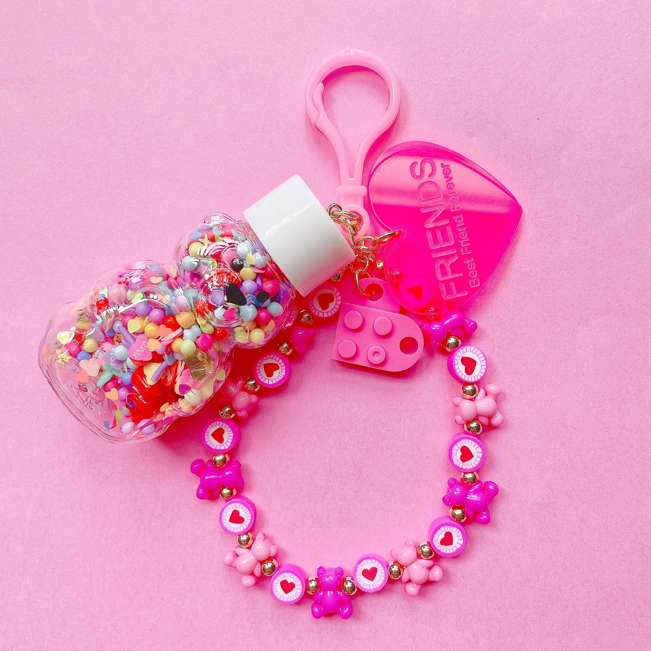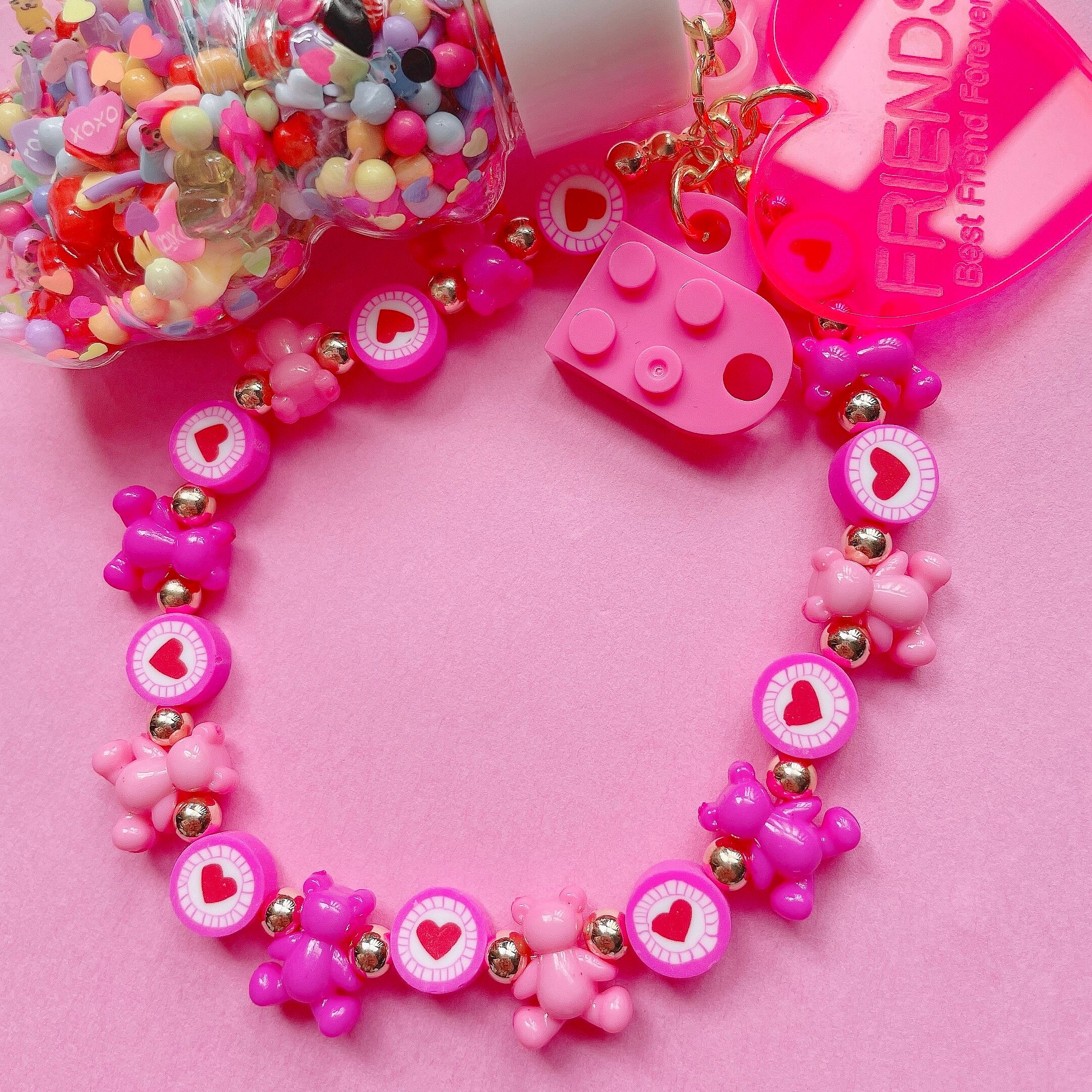 ネオンピンクのアクリルハートチャームが付いたピンクづくしのビーズストラップ風キーホルダーは、バッグチャームとしてカバンにぶら下げるのもおすすめです♡