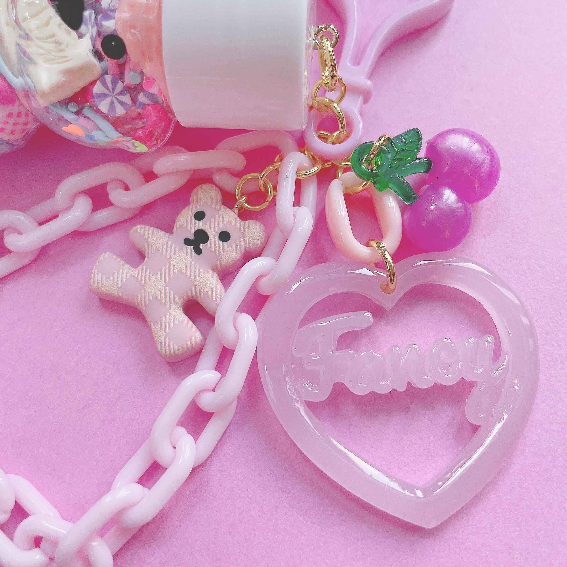 チェリーを添えたネオンサイン風なハートのチャームや、輪っか状に繋げたプラスチックチェーンにはくまが揺れ動きます。