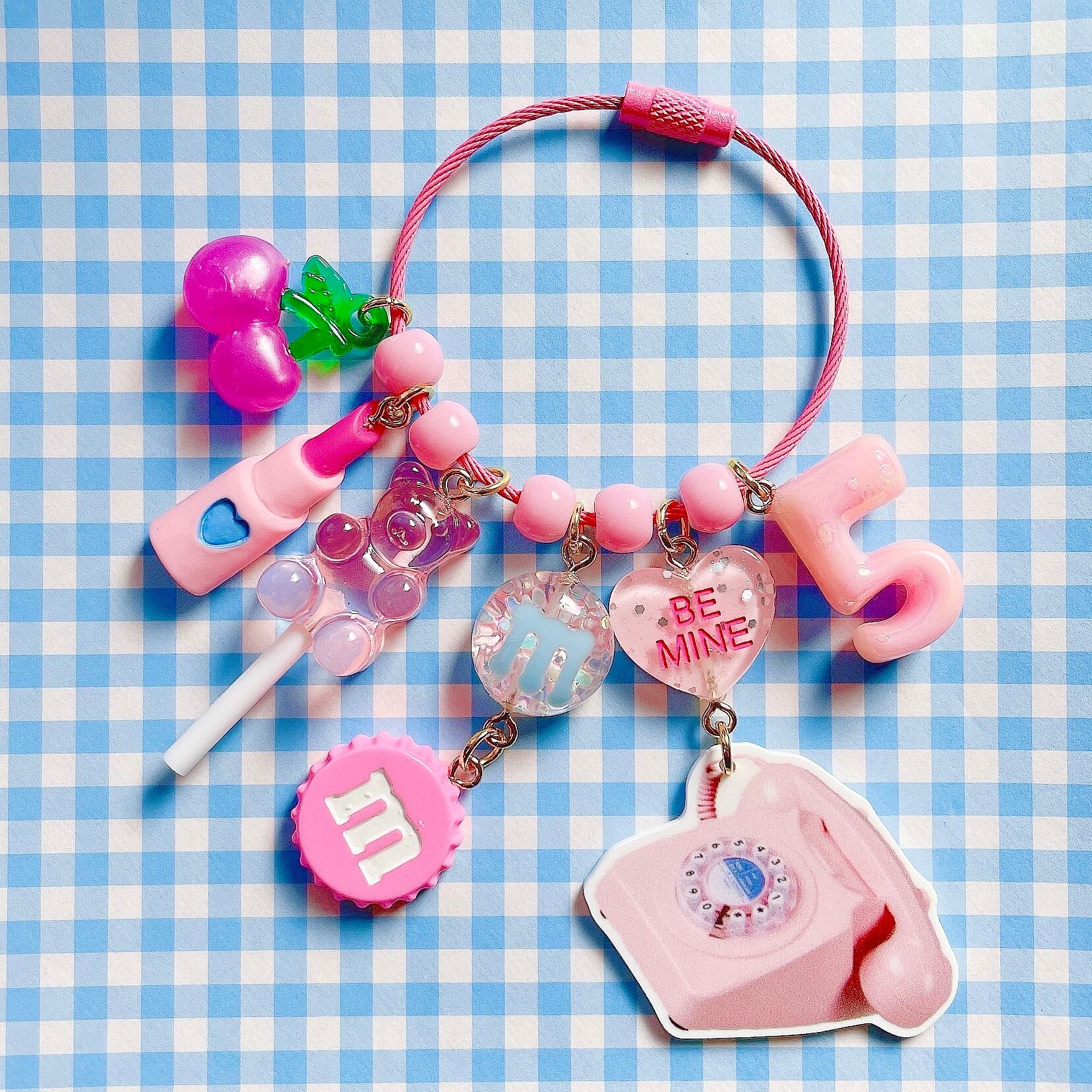 お菓子やリップ、電話にちなんだ数字のチャームが揺れ動きます。