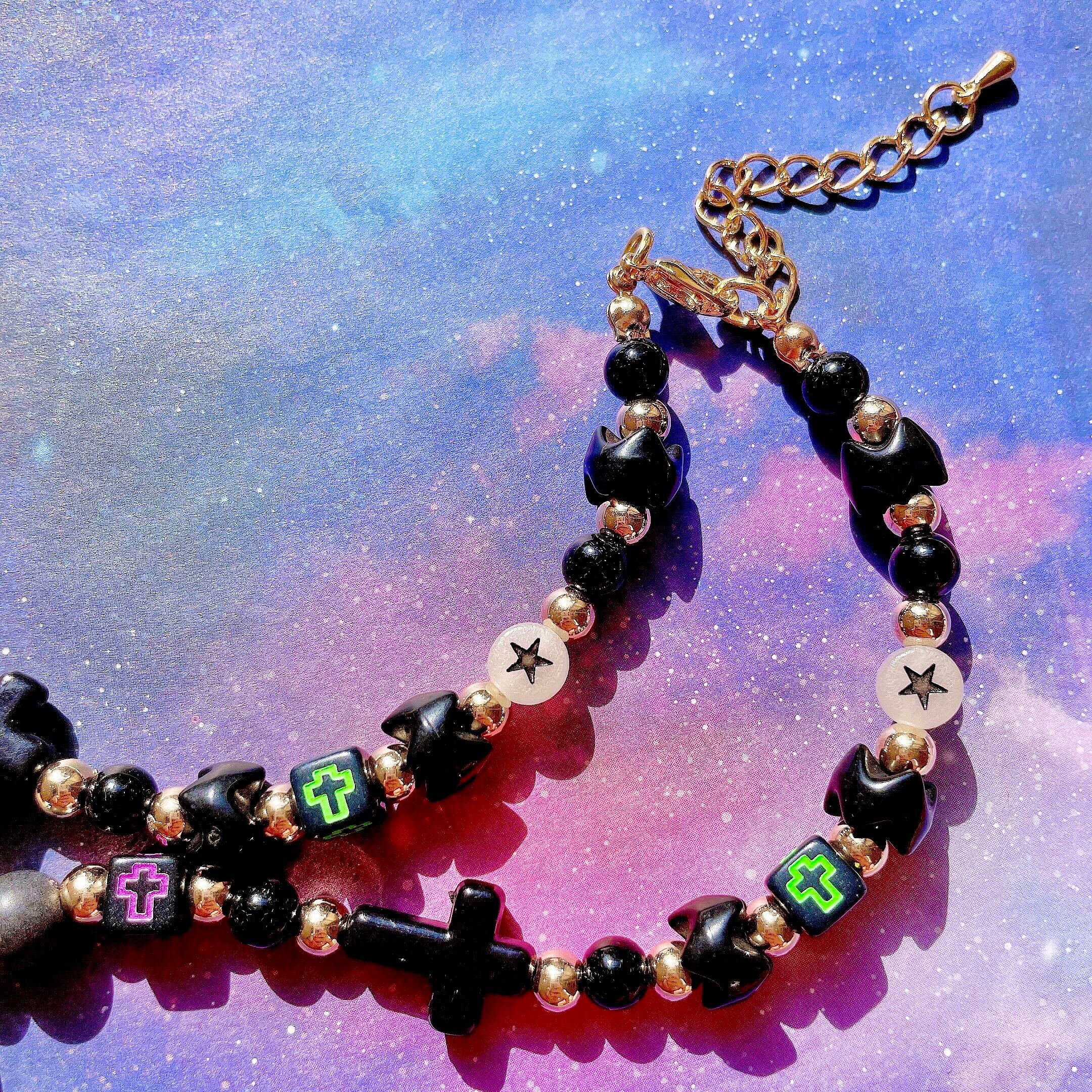 ブラックビーズに所々ネオンカラーのクロスが眩しいビーズネックレス。