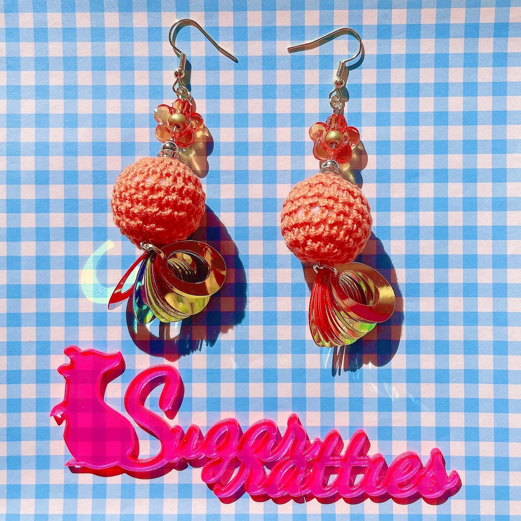 温もりを感じられるオレンジ色のニットビーズにクリアオレンジのお花、楕円フレームのスパンコールがレトロポップな雰囲気です。