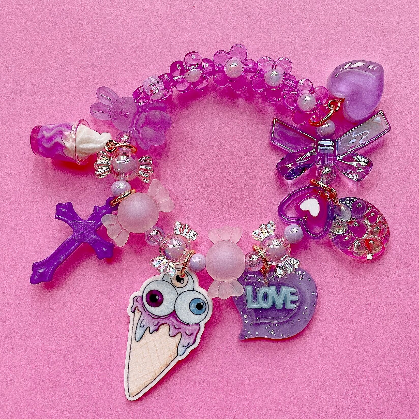 キャンディやお花のビーズに6つのチャームが揺れるボリューミーなブレスレット。