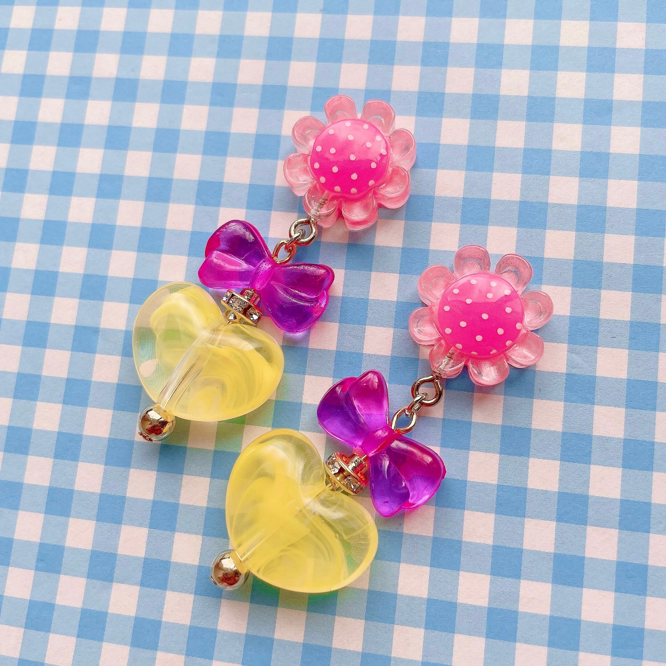 ドット模様のお花に、リボン、クリアマーブルなぷっくりハートが揺れるレトロキッチュなピアス。