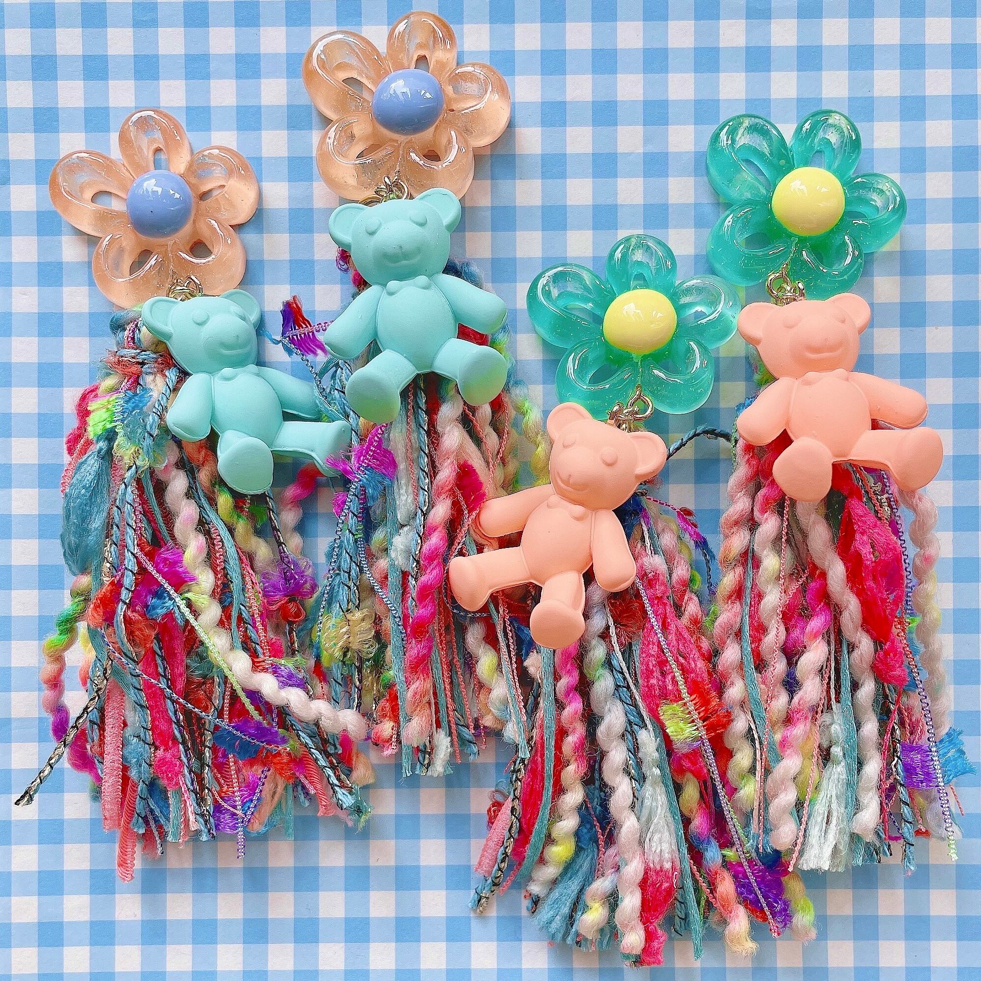 ぷっくりした大ぶりなお花に、テディベアを添えたカラフルで温かみのある引き揃え糸が揺れるピアス。