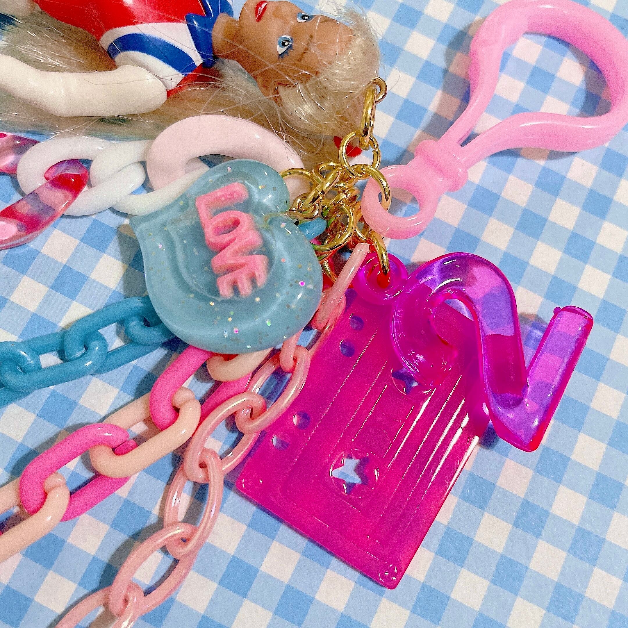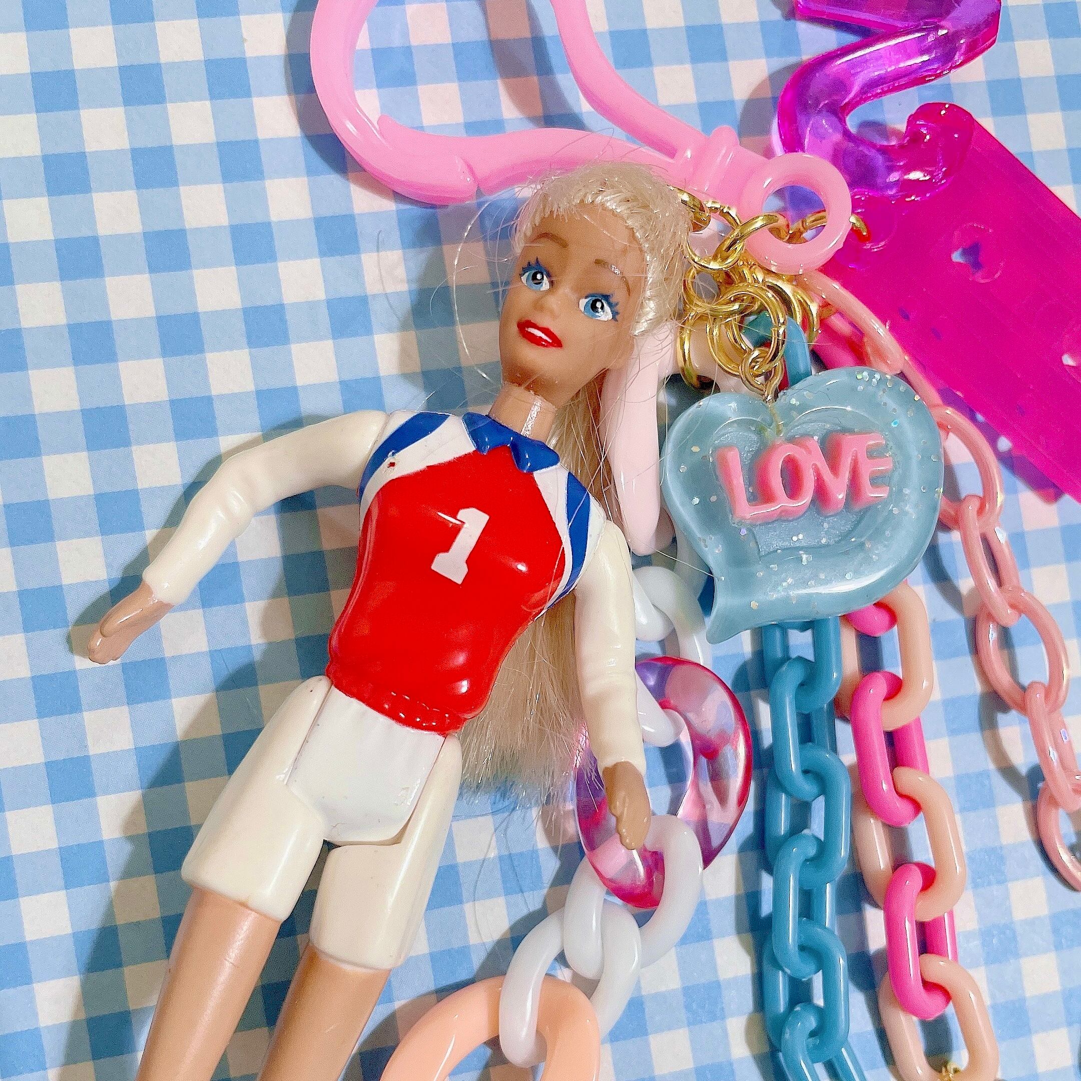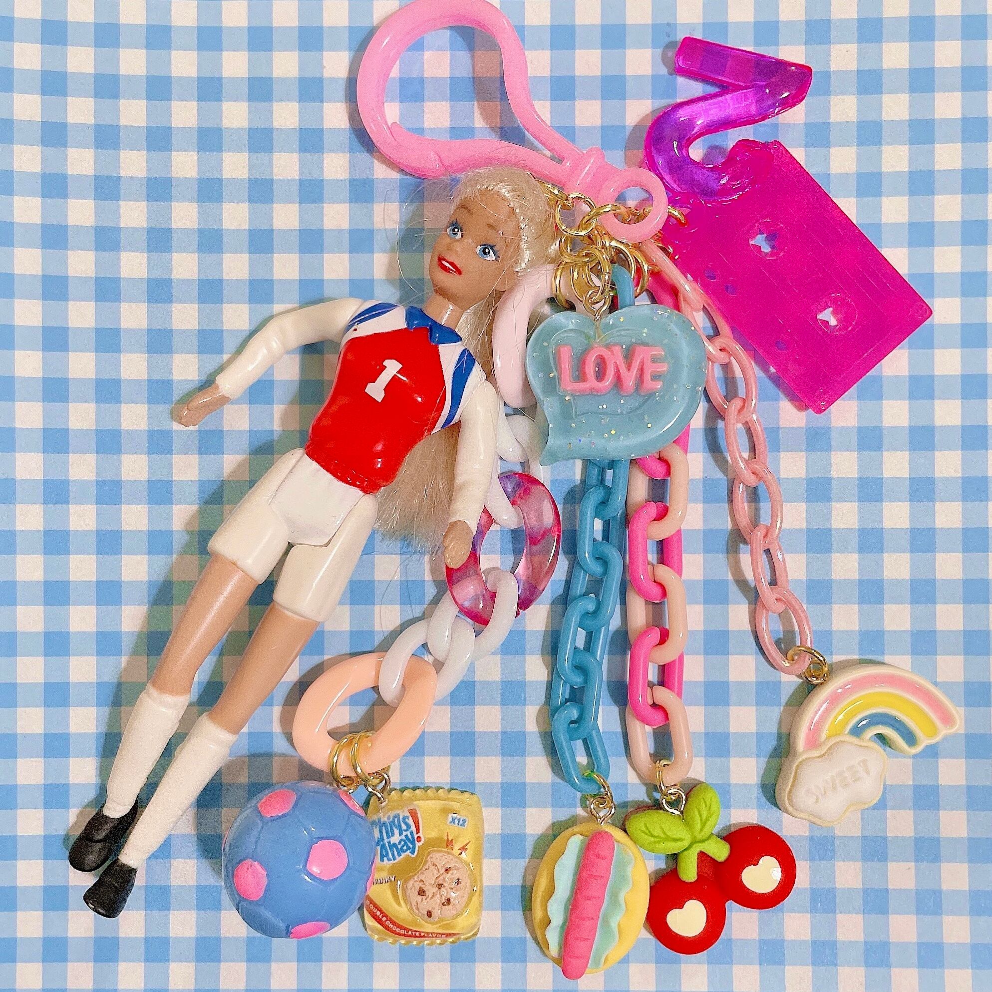ユニフォーム姿のヴィンテージUSドールをメインに、サッカーボールやフード、カセットテープにナンバーチャームなど盛りだくさんな、じゃらじゃらキーホルダー。