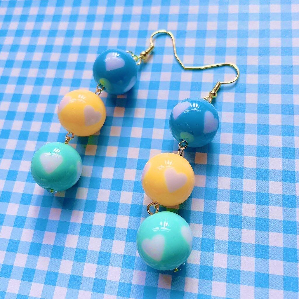 ハート柄のカラーボールが3つ連なる様は、まるで絵本の世界のいもむし!