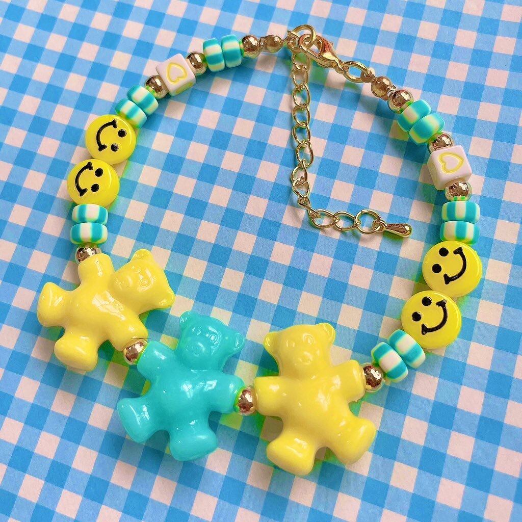 3匹のくまさんを、スマイルビーズやキャンディみたいな樹脂ビーズで繋いだビーズブレスレット。