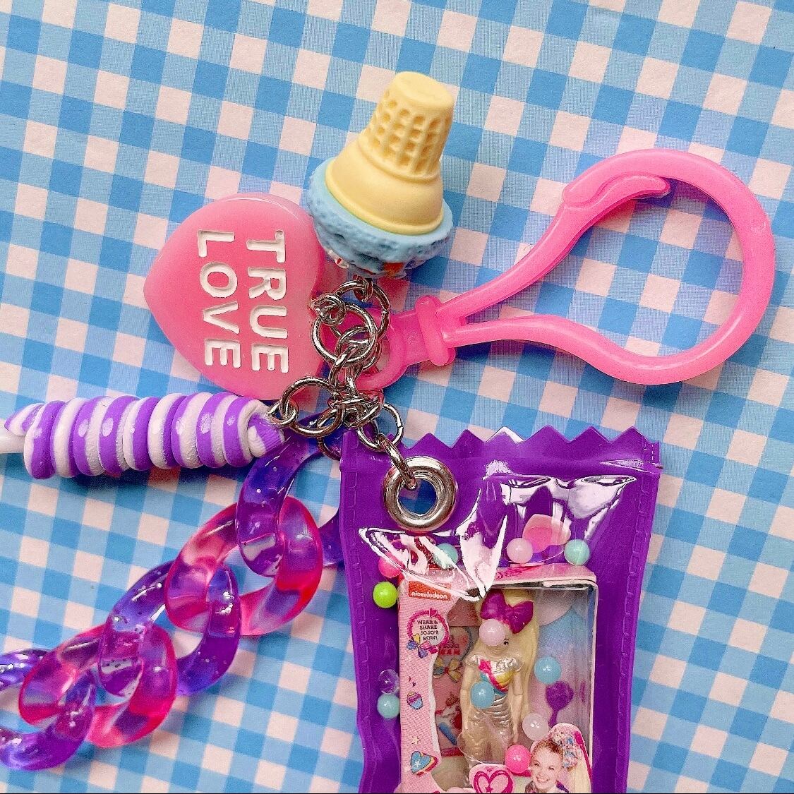 海外女児のおもちゃのパッケージ、アイスクリーム、キャンディハーツ、棒付きキャンディ、プラチェーンからなるキーホルダー。