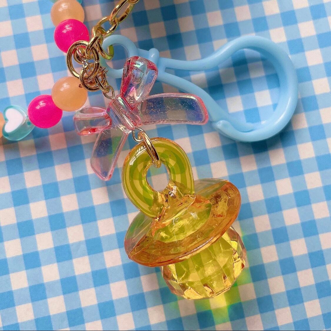 ストラップ風に連ねたビーズに、リングキャンディを添えたキーホルダーは、バッグチャームとしてカバンにぶら下げるのもおすすめです♡