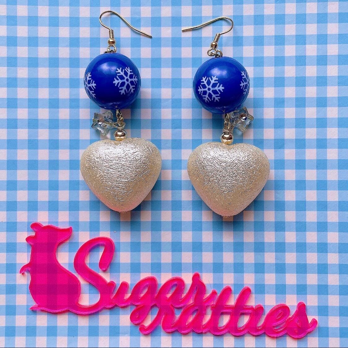 雪の結晶が描かれたブルーのカラーボールにホワイトハートが揺れるピアス。