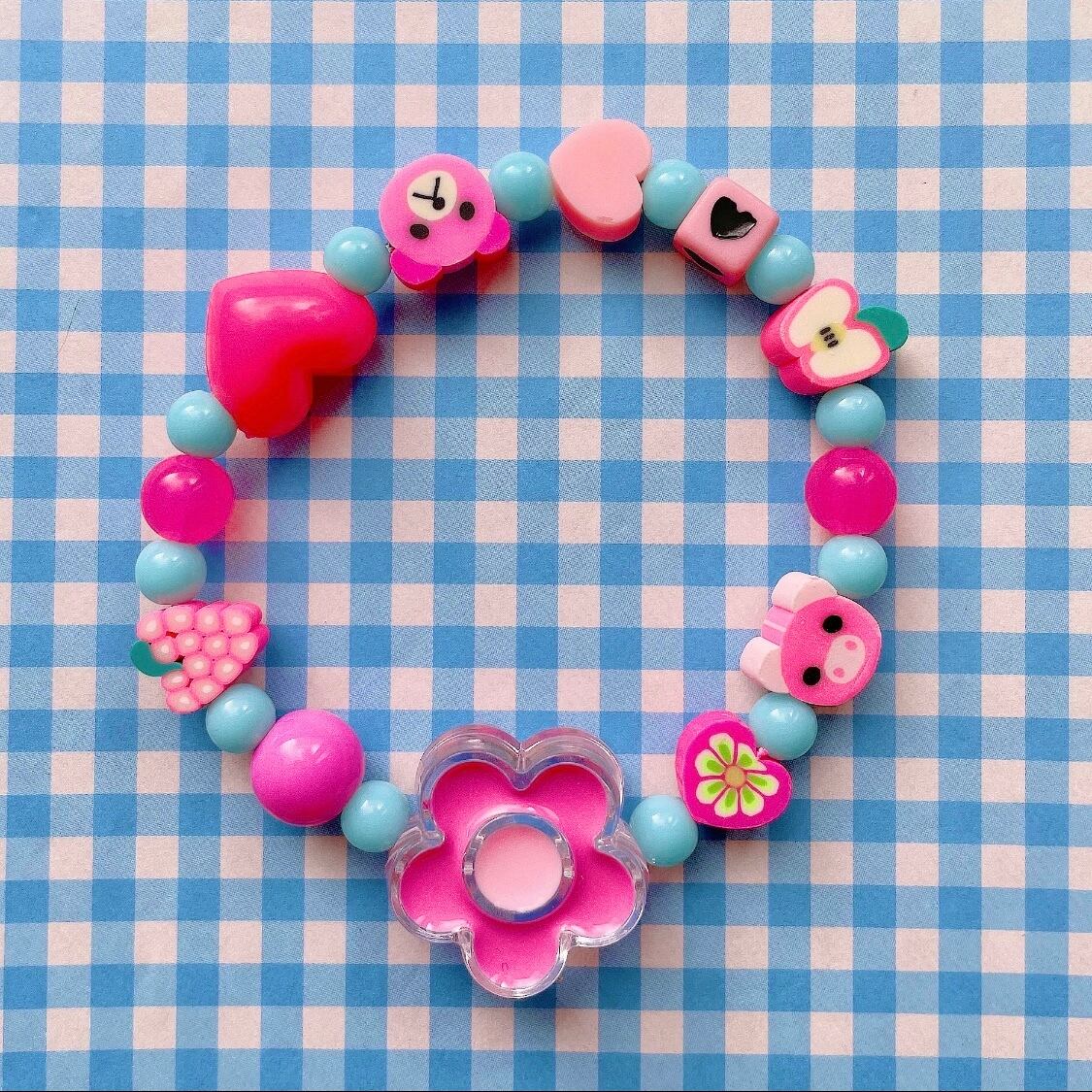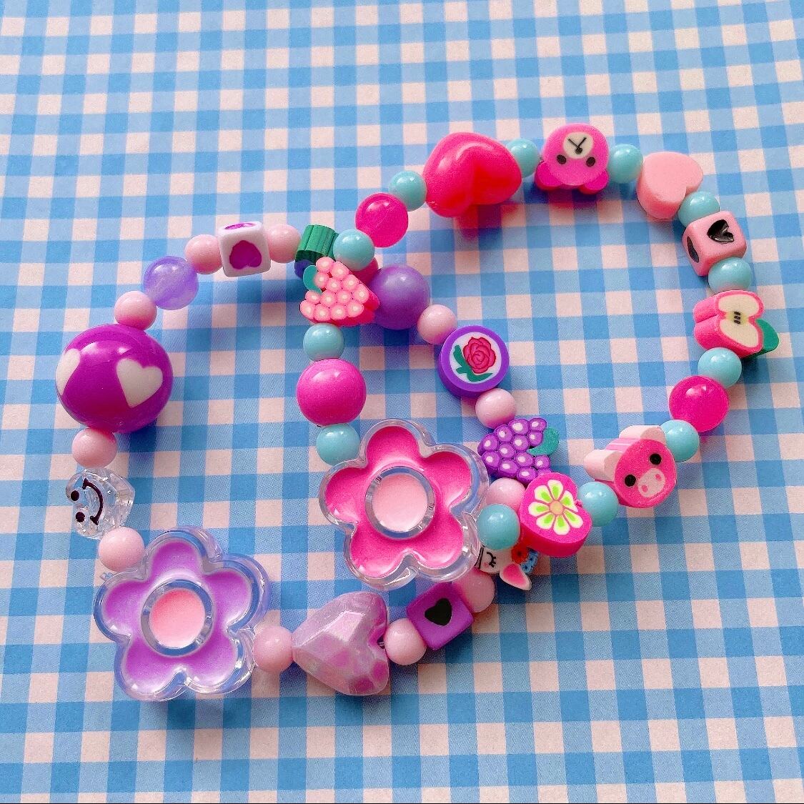 お花のビッグビーズと色々なクレイビーズを間に挟んだビーズブレスレット。