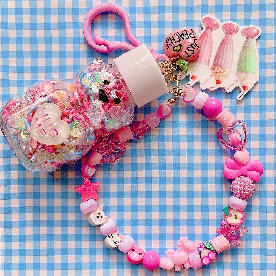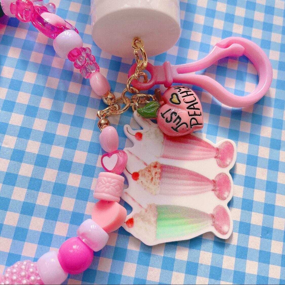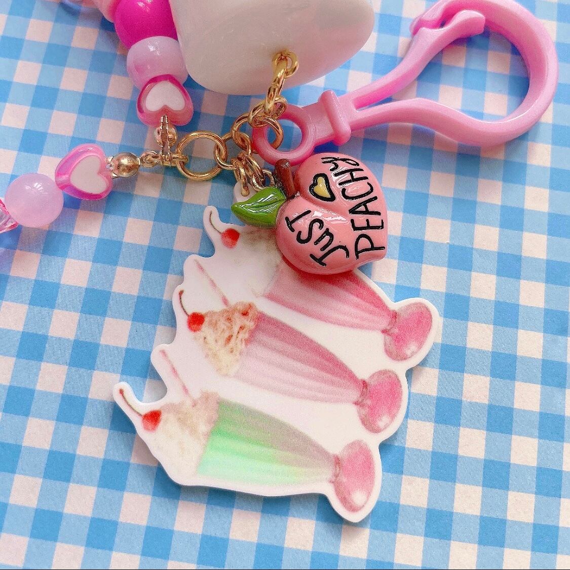 ストラップ風に連ねた色んな形のビーズに、大きなピーチとミルクセーキのチャームを添えたキーホルダーは、バッグチャームとしてカバンにぶら下げるのもおすすめです♡