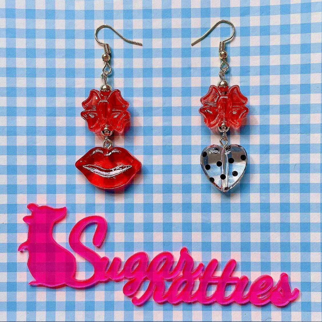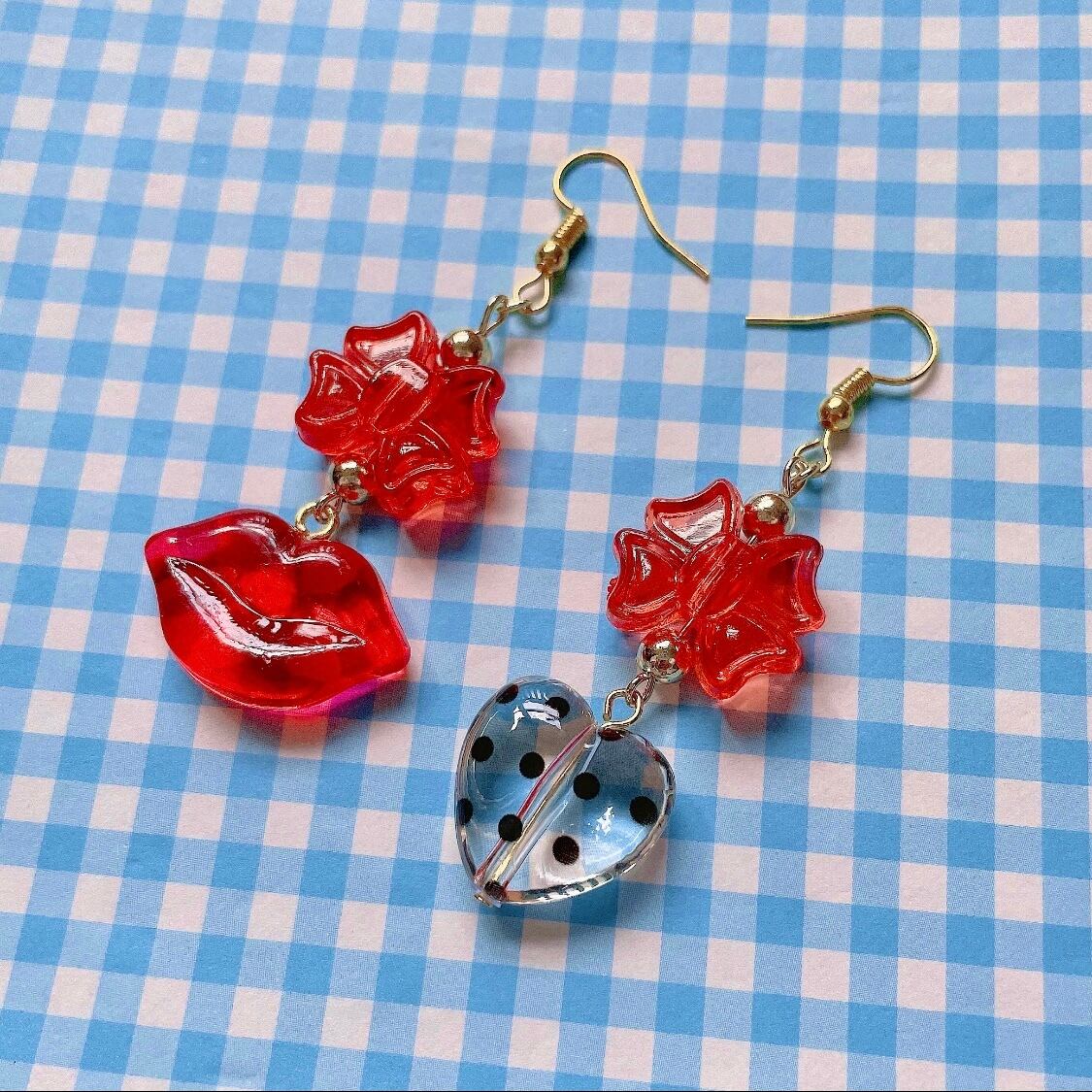 星型のラッピングリボンのようなアクリルビーズに、左右それぞれリップモチーフとドット模様のハートを連ねたピアス。