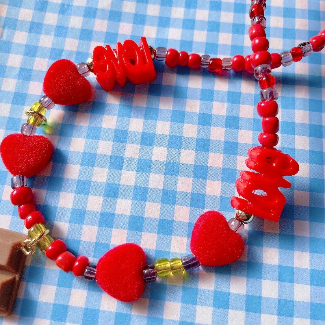 トップにチョコレートが揺れる、フロッキー素材のハートや文字ビーズを組み込んだガラスビーズネックレス。