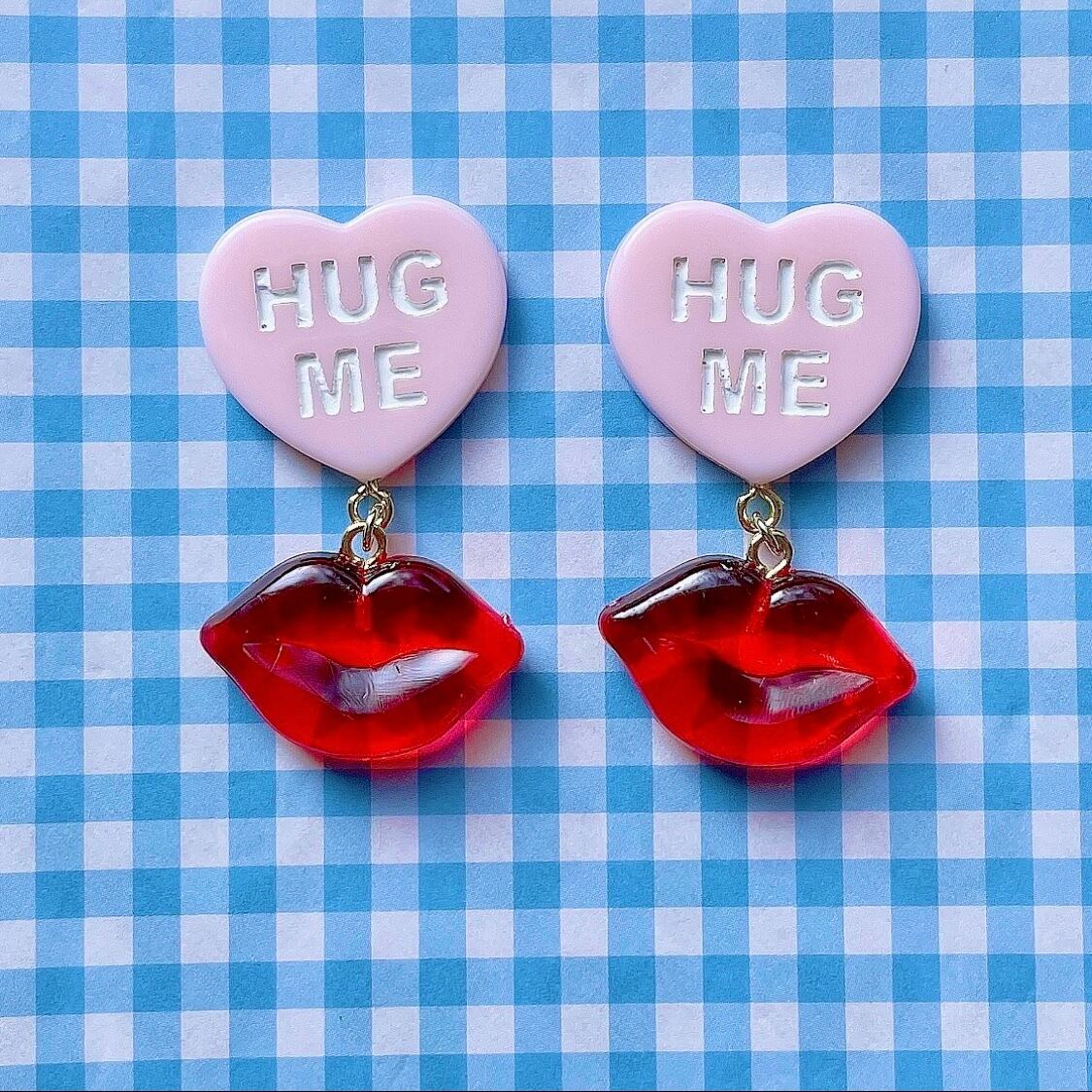 甘いベビーピンクのキャンディハーツにリップモチーフが揺れるピアス。