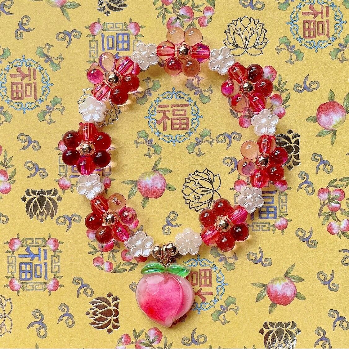 煌めく多面カットの桃が揺れる、お花のビーズブレスレット。