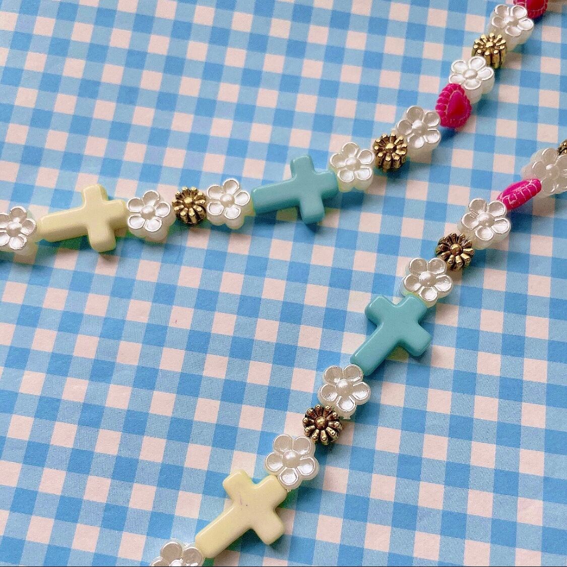 お花や十字架、小さなハートを連ねたビーズネックレス。