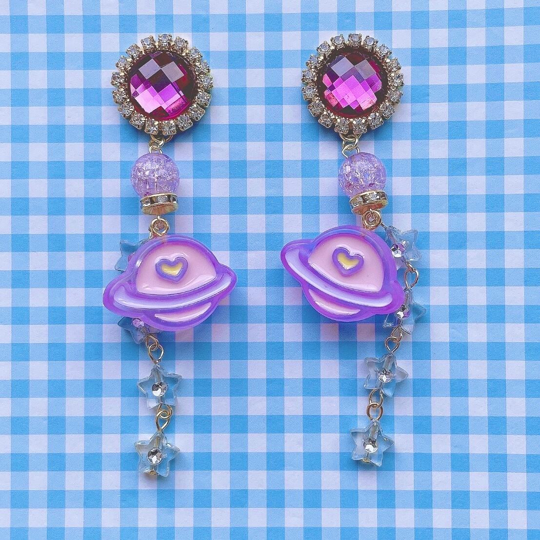 キラキラのビジューに惑星と星屑が揺れるピアス。