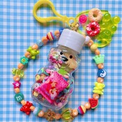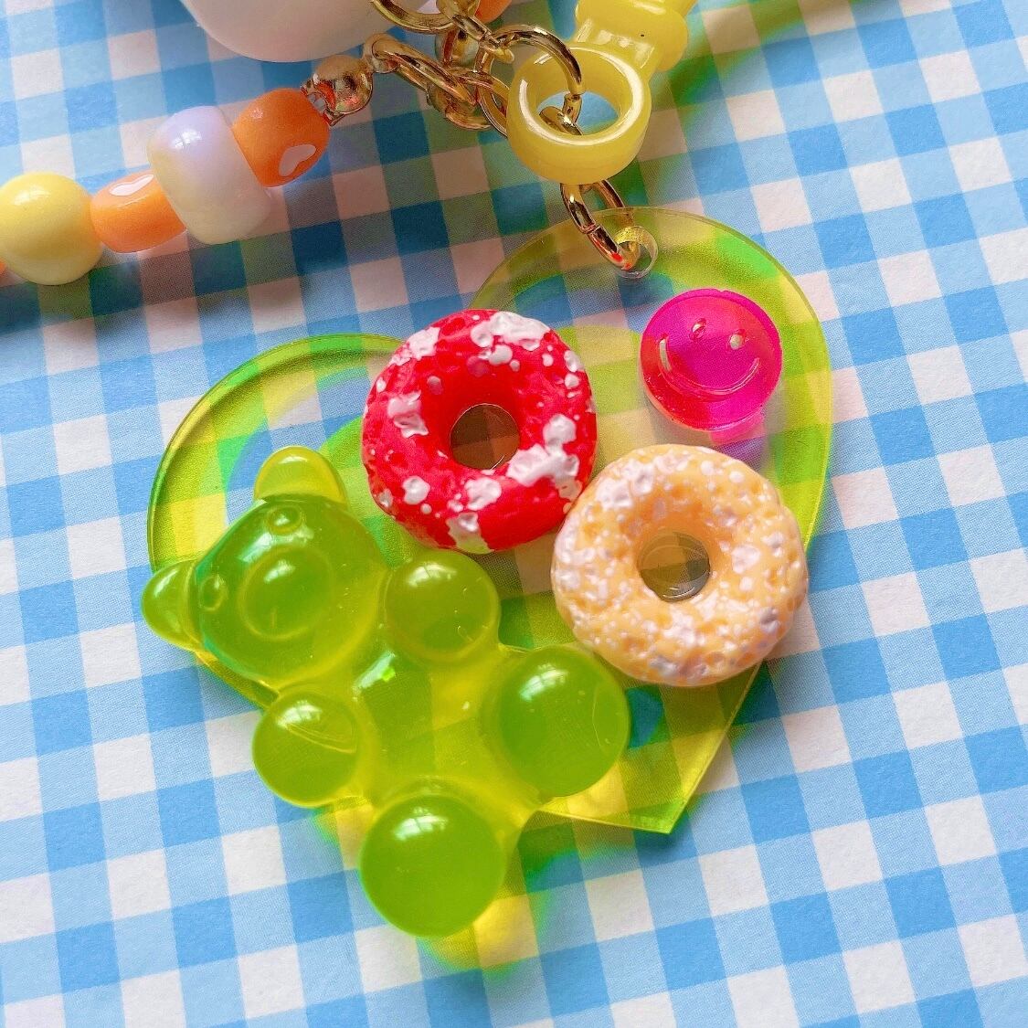 ストラップ風に連ねた色んな形のビーズに、グミベアやシリアルを貼り付けたハートのプレートを添えたキーホルダーは、バッグチャームとしてカバンにぶら下げるのもおすすめです♡