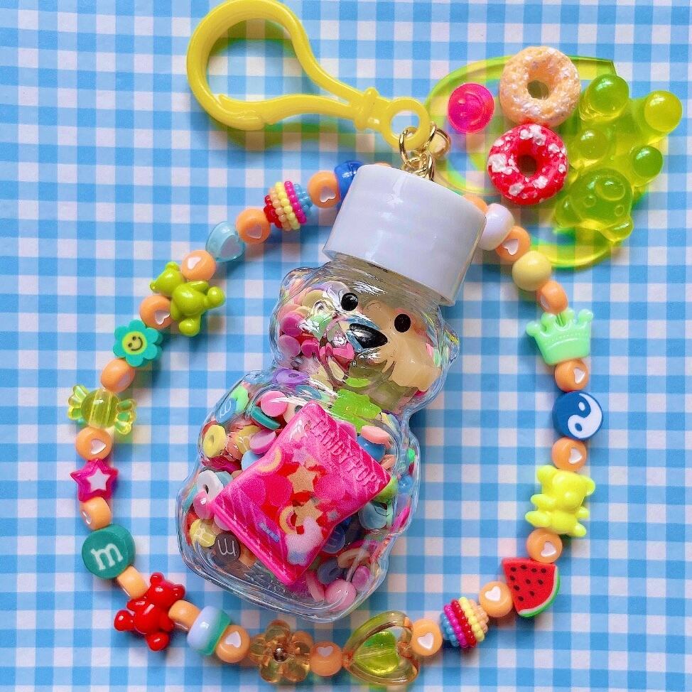 ボトルの中にはカラフルな樹脂フレークや、ビーズ、グミベア風パーツなどをたっぷり詰め込みました。