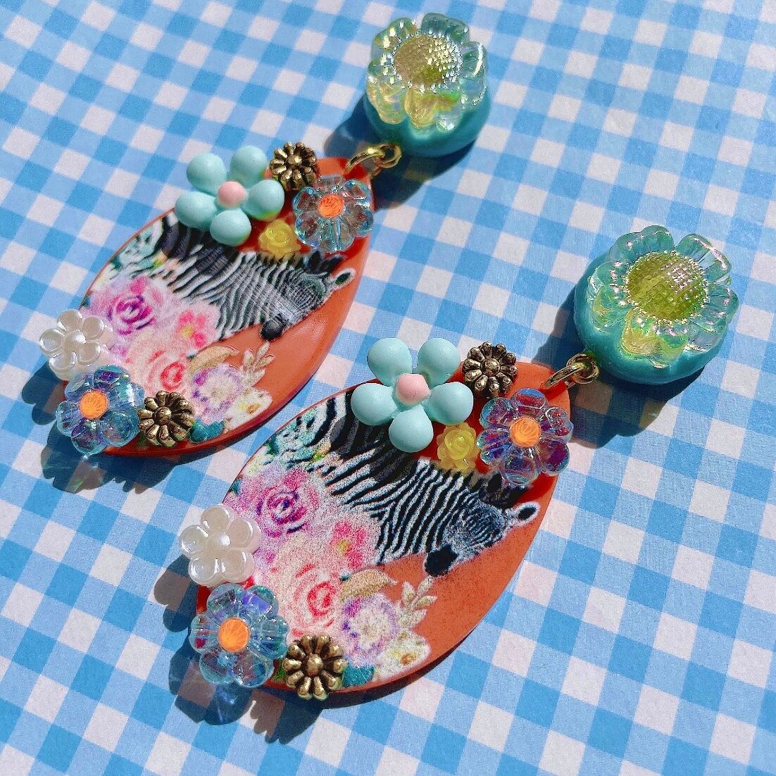 色とりどりのお花とシマウマが描かれたオレンジのプレートが揺れるピアス。