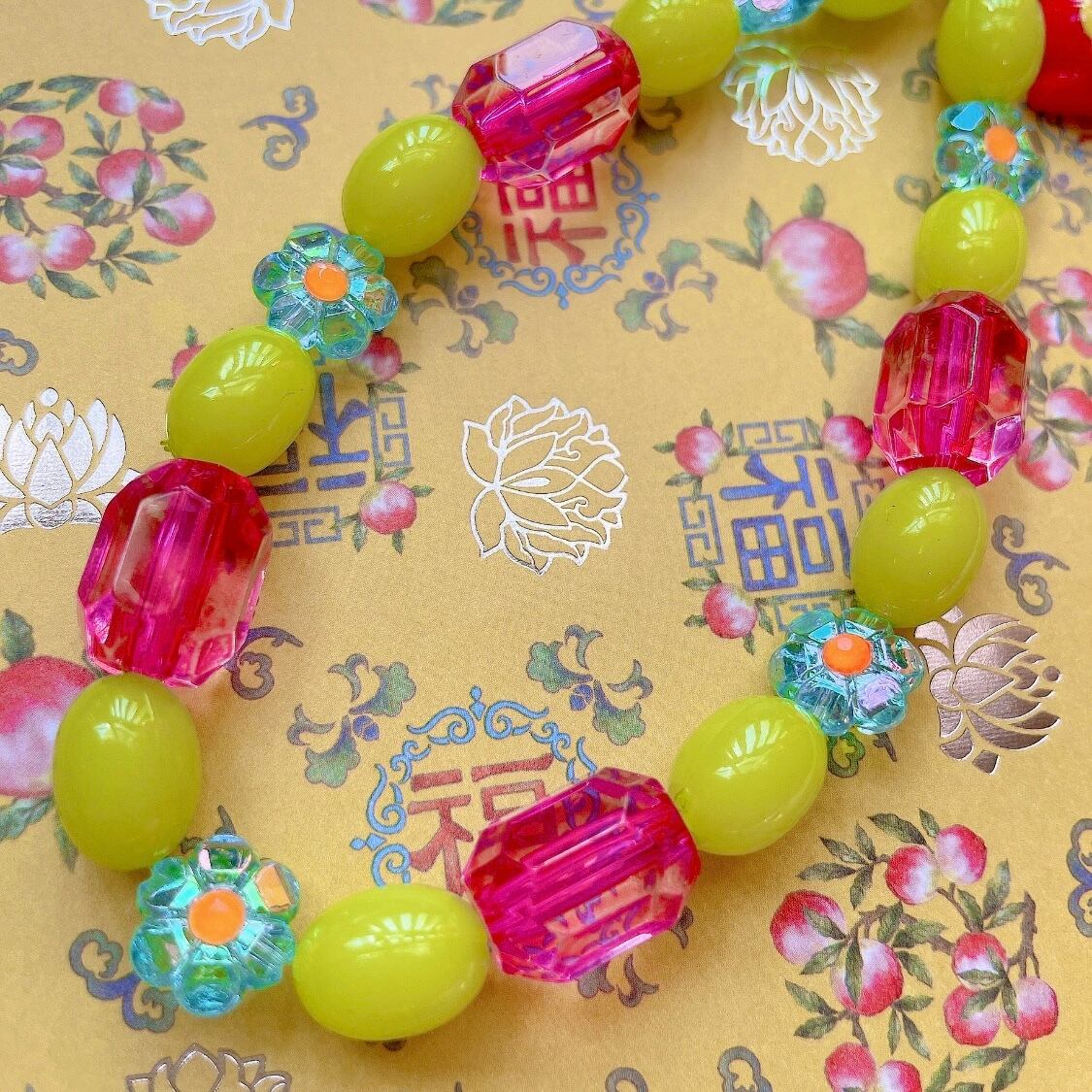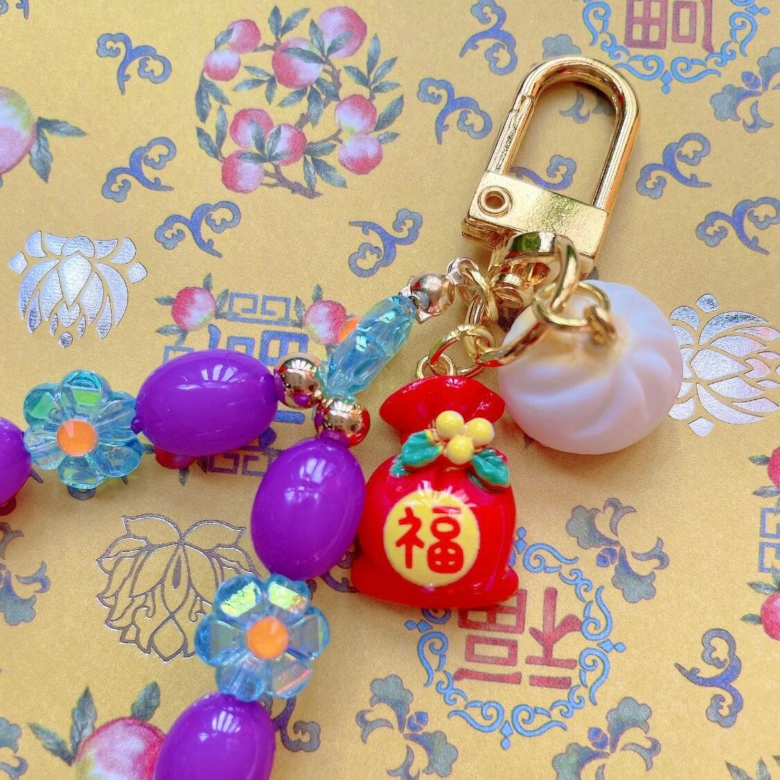 肉まんと福巾着チャームが揺れるビーズストラップ。