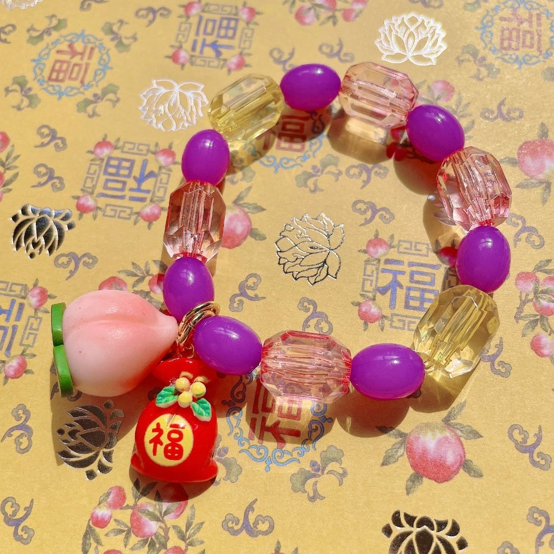 ころんと可愛らしい桃と縁起物の巾着チャームが揺れるビーズブレスレット。