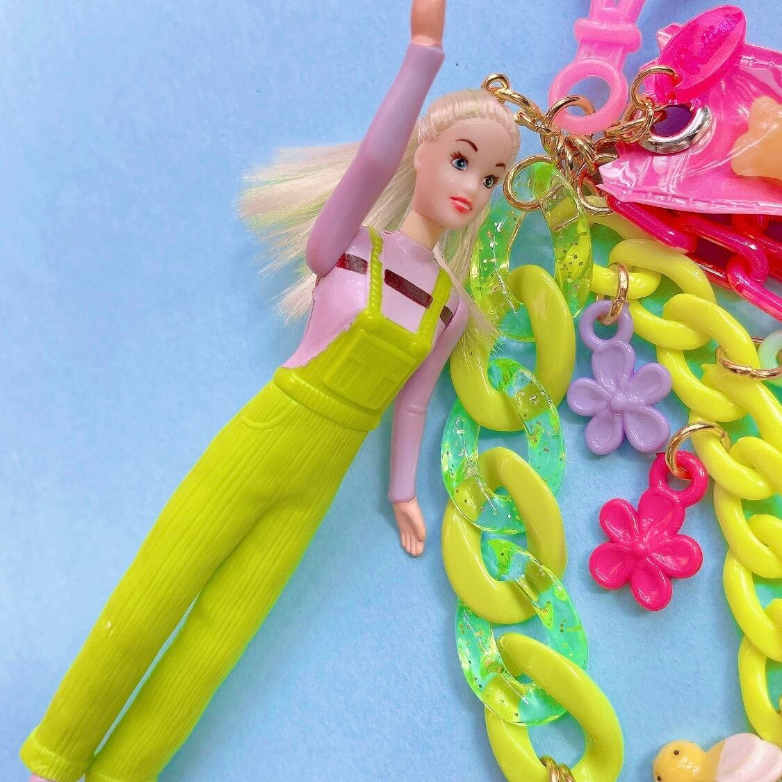 70'sヒッピー風の、鮮やかなライトグリーンのサロペットスタイルがレトロ可愛いUSドール付きキーホルダー。
