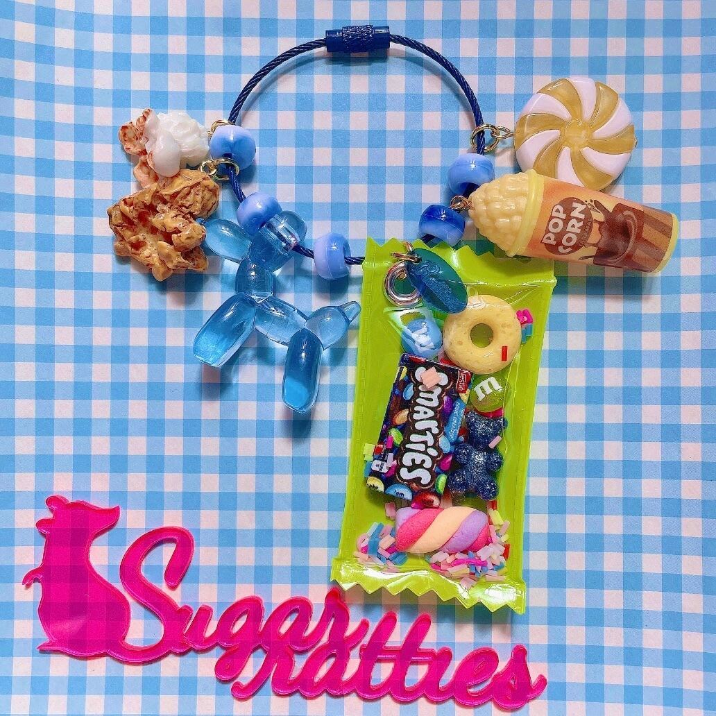 ポップコーンやバルーンドッグ、お菓子の詰め合わせパッケージ、ぐるぐるキャンディが揺れるワイヤーキーリング。