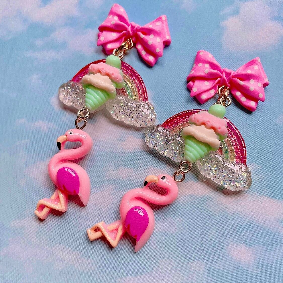 キラキラの虹に重なり揺れるアイスクリームとフラミンゴのピアス。