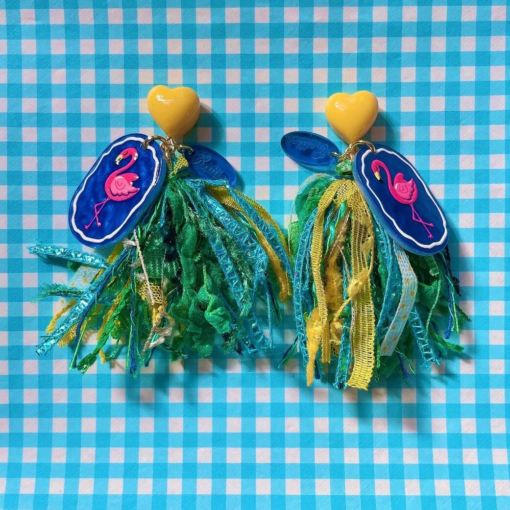 ぷっくりとしたハートに、フラミンゴが描かれたタグとカラフルな引き揃え糸が揺れるピアス。