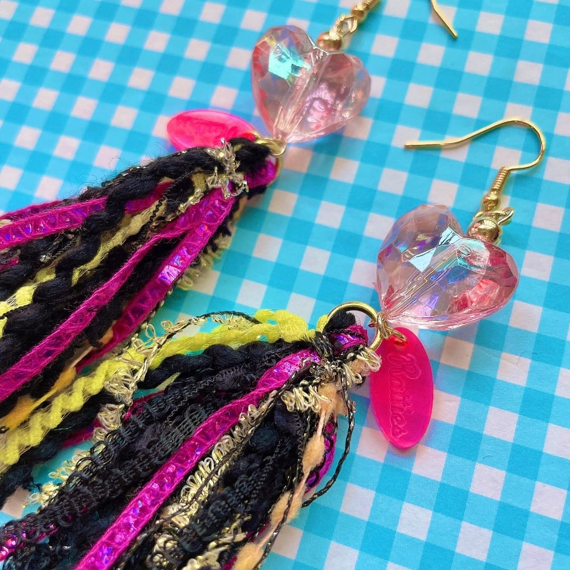 オーロラに煌めくピンクのハートと、引き揃え糸のタッセルピアス。