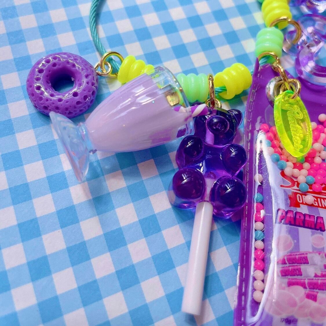 お菓子のパッケージチャームやグミベアロリポップ、シリアル、ドリンクなどが揺れるワイヤーキーリング。