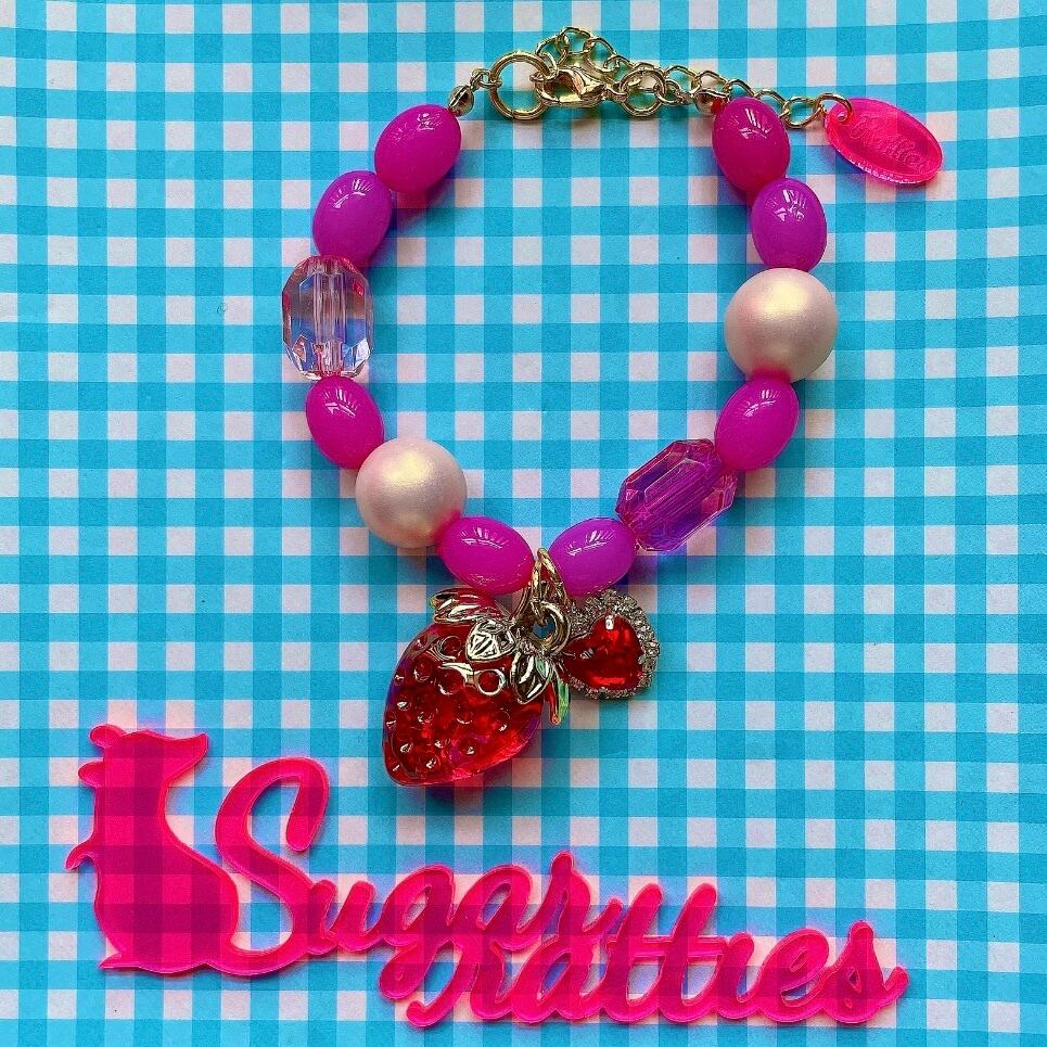 ピンクのビーズを3種類ランダムに連ねた先に、大粒の苺が揺れるビーズブレスレット。