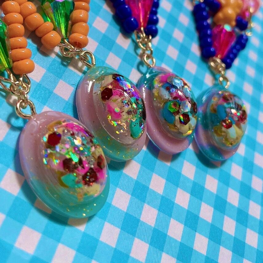 ゴールドラメを混ぜた2色のミルキーカラーが混ざり合う土台と、上に乗せたホログラムやラメ、ポリマークレイを埋め込んだお手製のレジンパーツは、似ているようで土台や中の封入物のカラーが微妙に異なります。