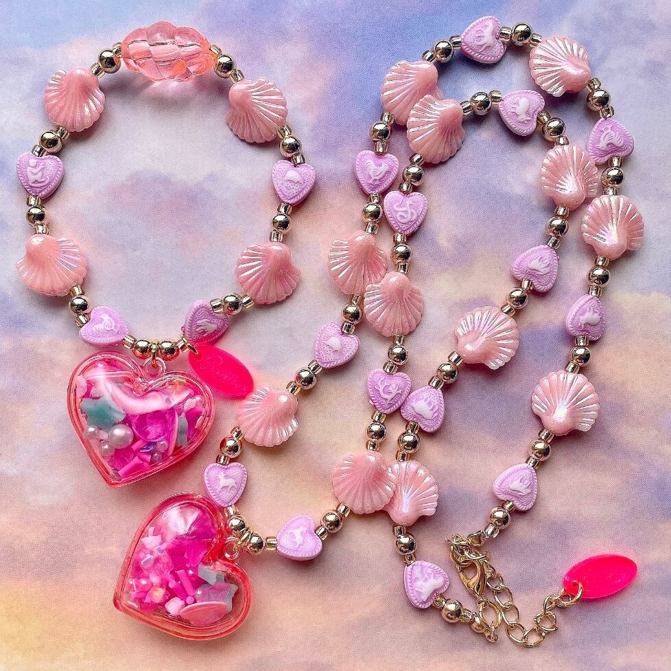 クリアピンクのカプセルには粘土パーツやカラースプレー、パールなどが入っており、ブレスレット部分は、オーロラ加工のシェルビーズをガラスビーズやメタルビーズで繋いだ華奢なデザインです。