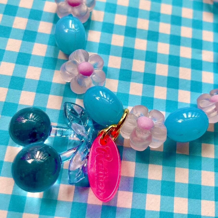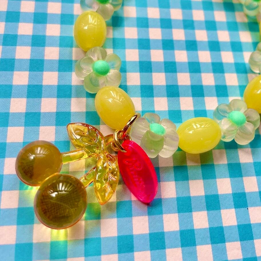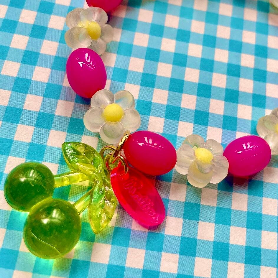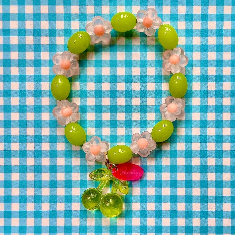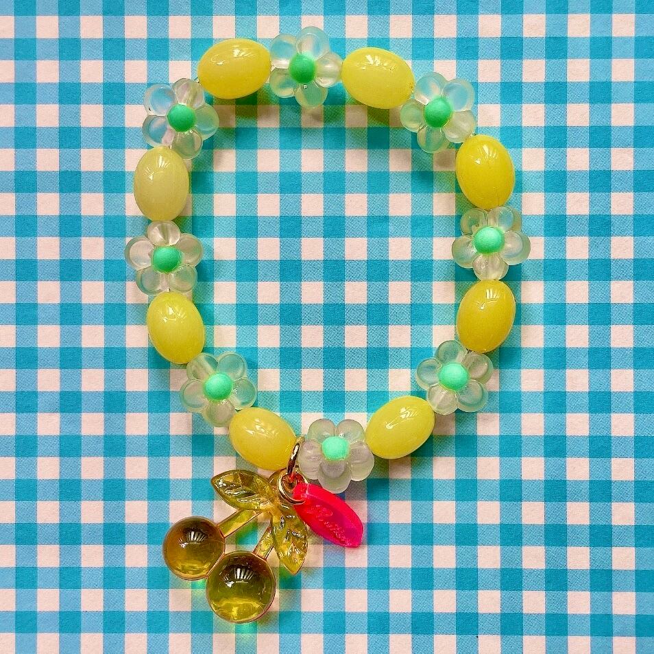 ゼリービーンズ風ビーズとお花のビーズに、クリアカラーのさくらんぼチャームが揺れるビーズブレスレット。