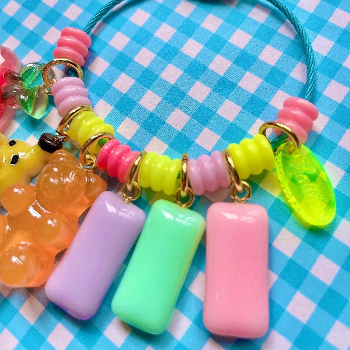 チェリーバナナ、オレンジフレーバーのグミベアロリポップ、3つのフルーツガムが揺れるワイヤーキーリング。