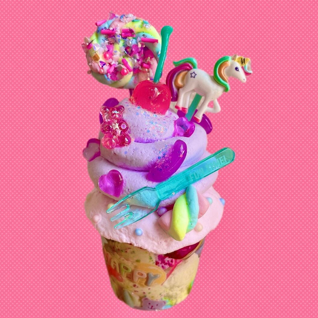 透け感あるチェリーやゼリービーンズに、ぐるぐるキャンディやユニコーンを飾りました。
