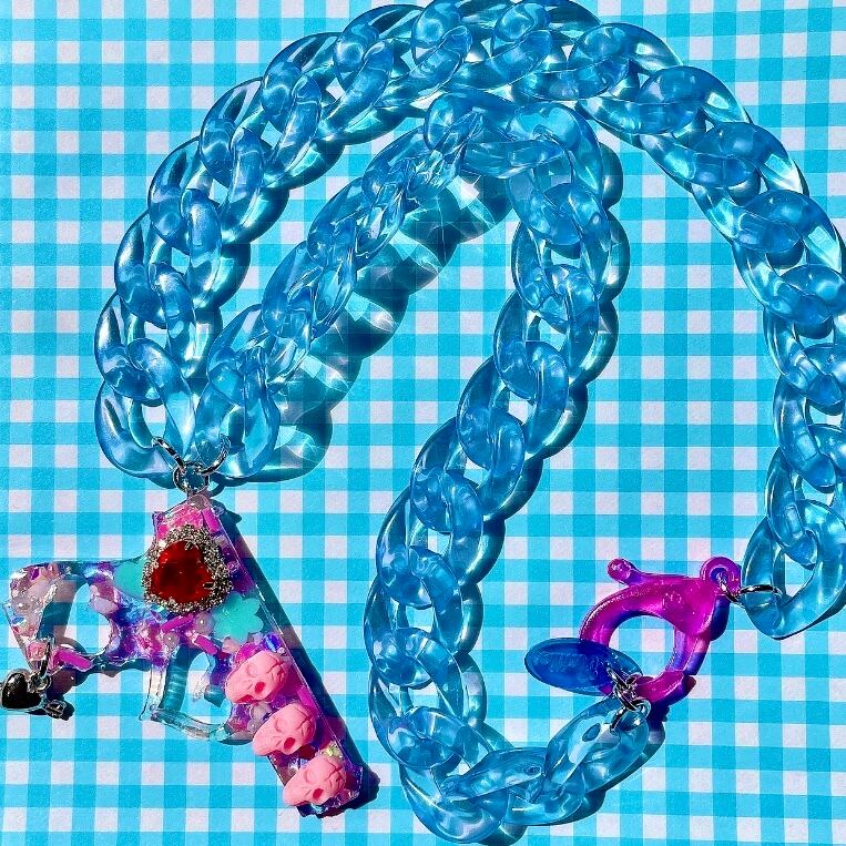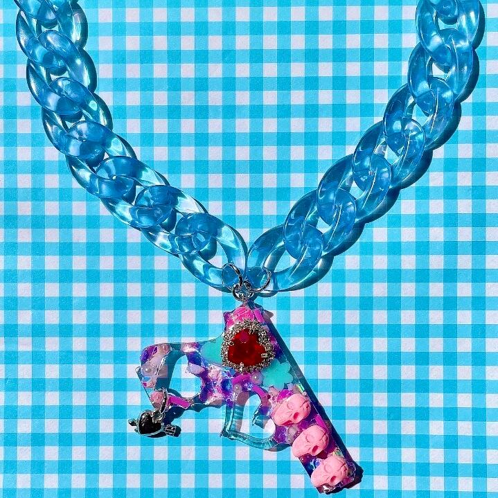 大ぶりのピストルモチーフが揺れるプラスチックチェーンのネックレス。