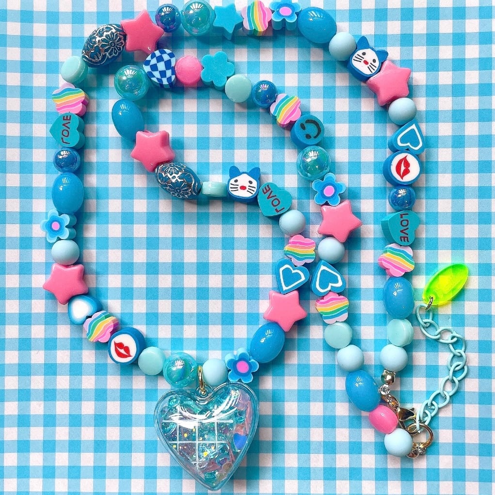 色々な形の樹脂ビーズやアクリルビーズに、ハートのカプセルが揺れ動きます♡