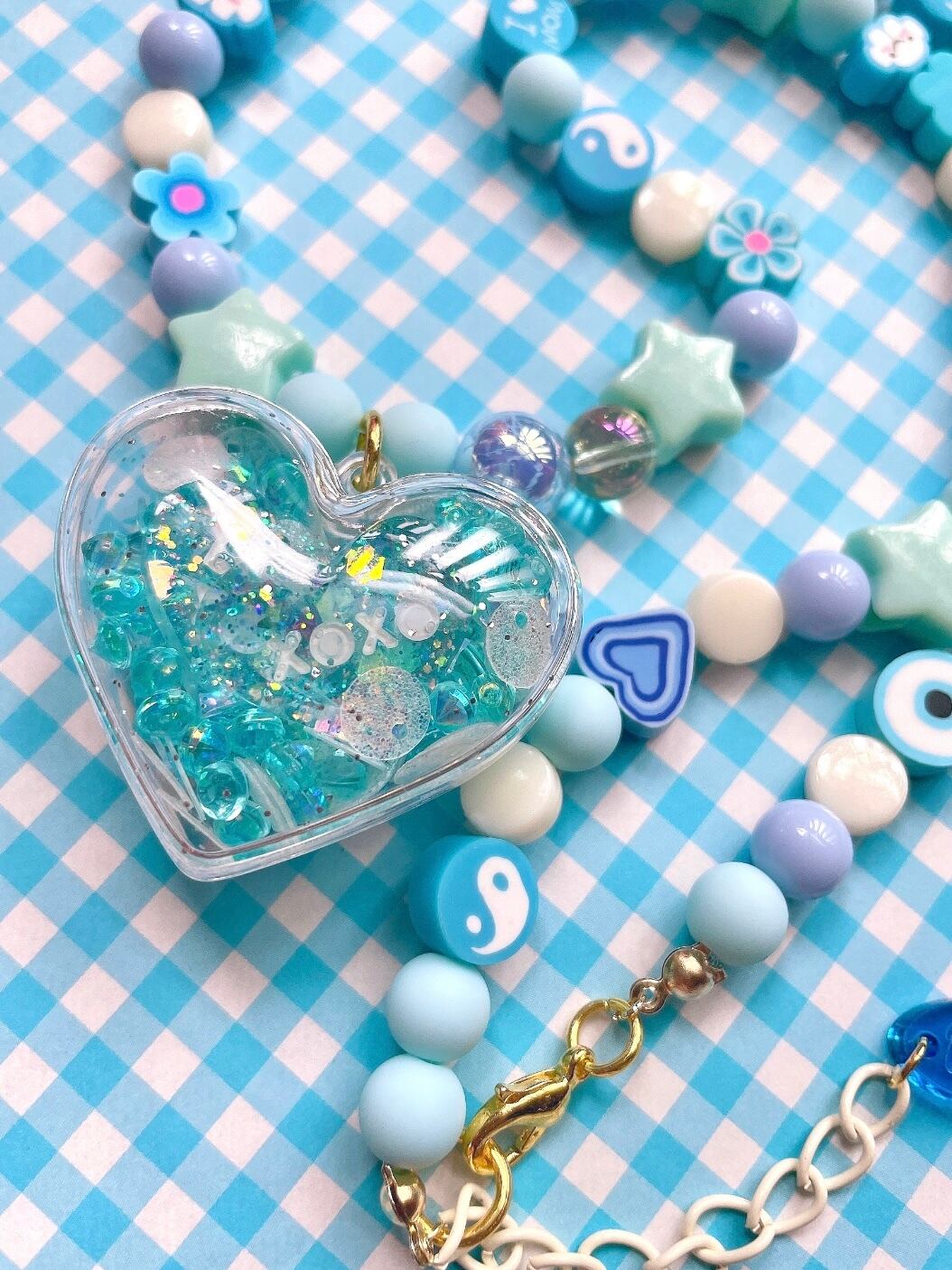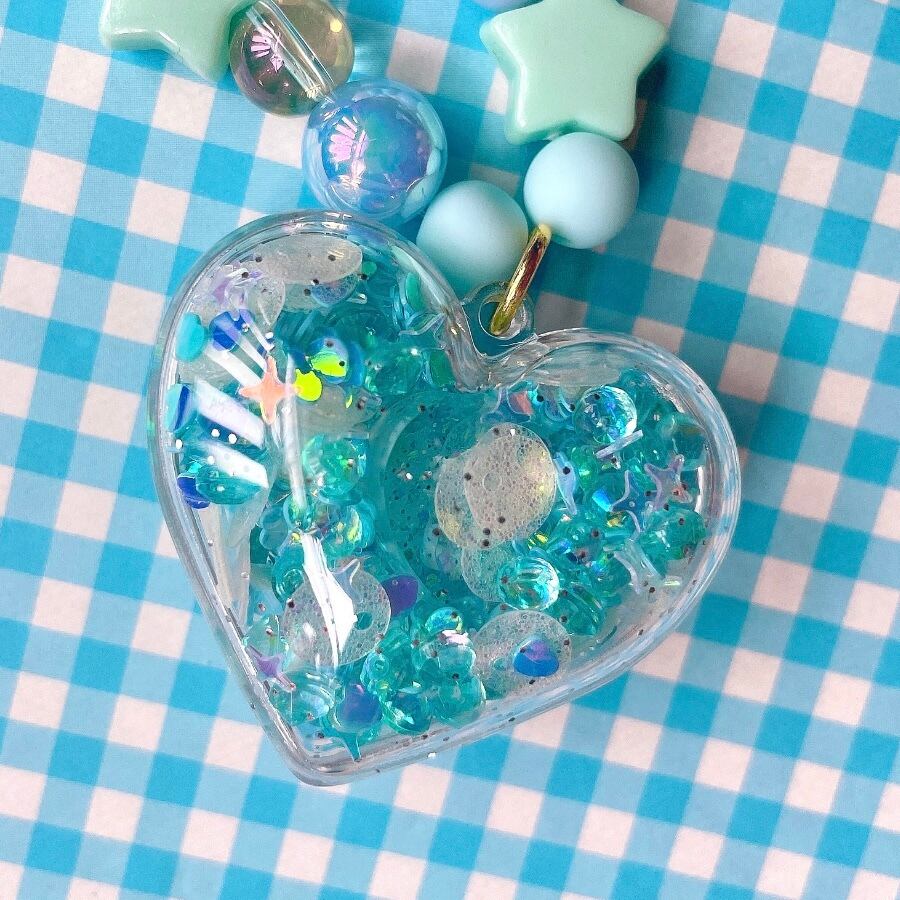色々な形の樹脂ビーズやアクリルビーズに、大粒ハートのカプセルが揺れ動きます♡