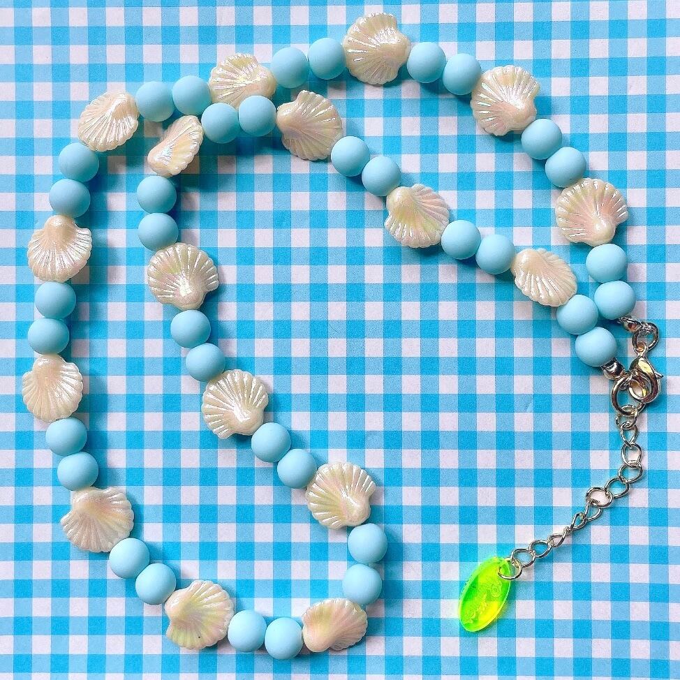 画像①~③のように、貝殻モチーフとマットな水色のネックレスに、オーロラパールを挟んだグリーンのガラスビーズネックレスを巻き付けていけば、あぶくや海藻が絡まり合いながら波に揺られるイメージの一本のネックレスが完成します。